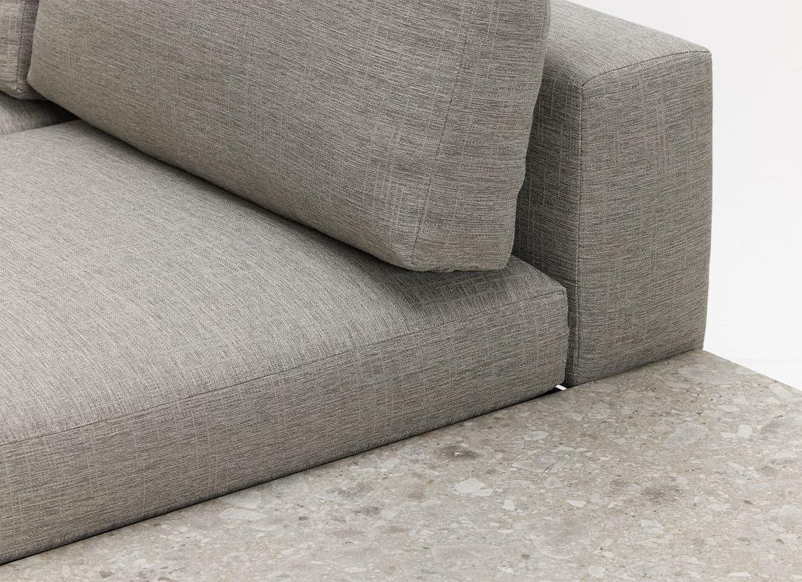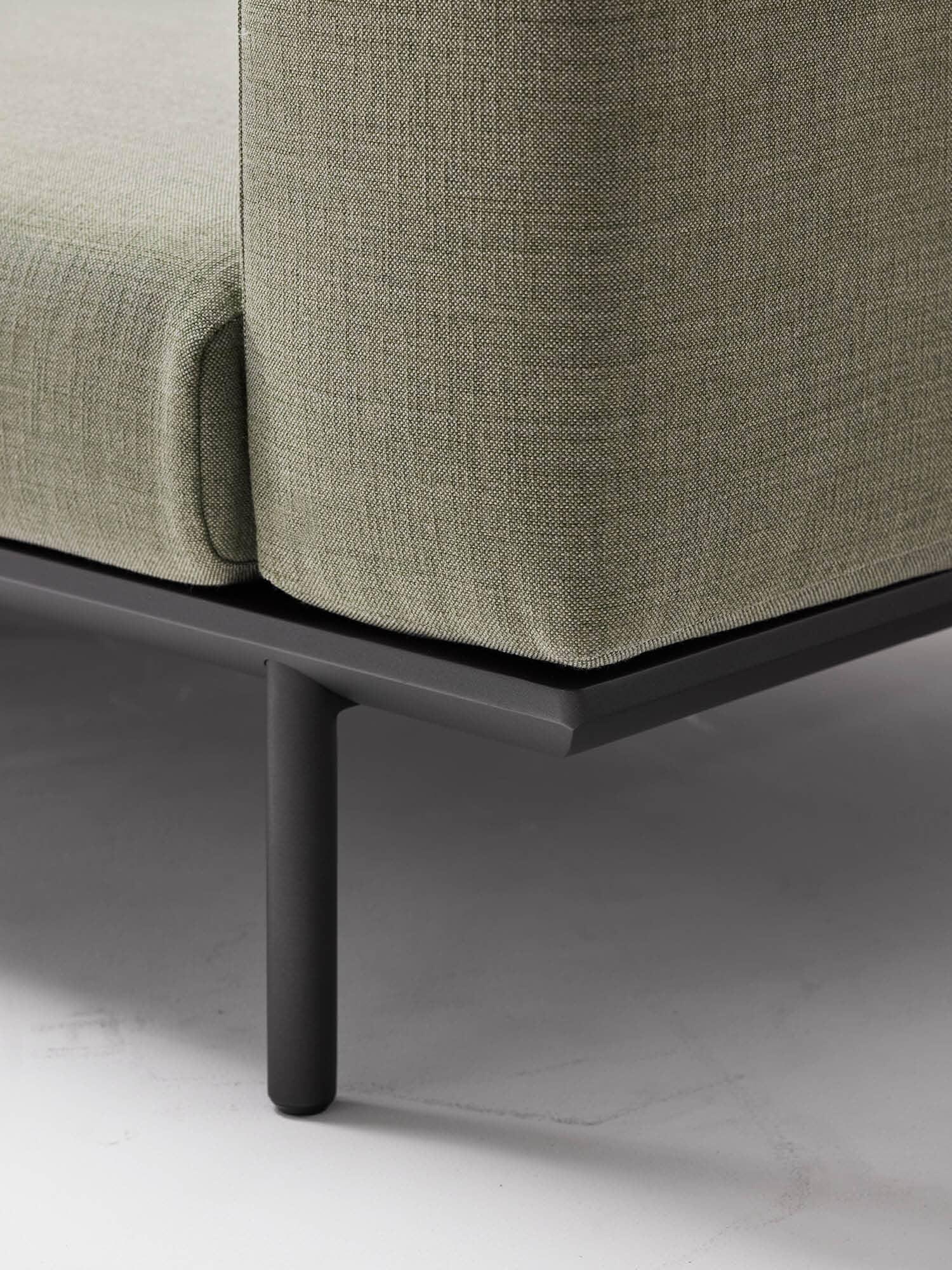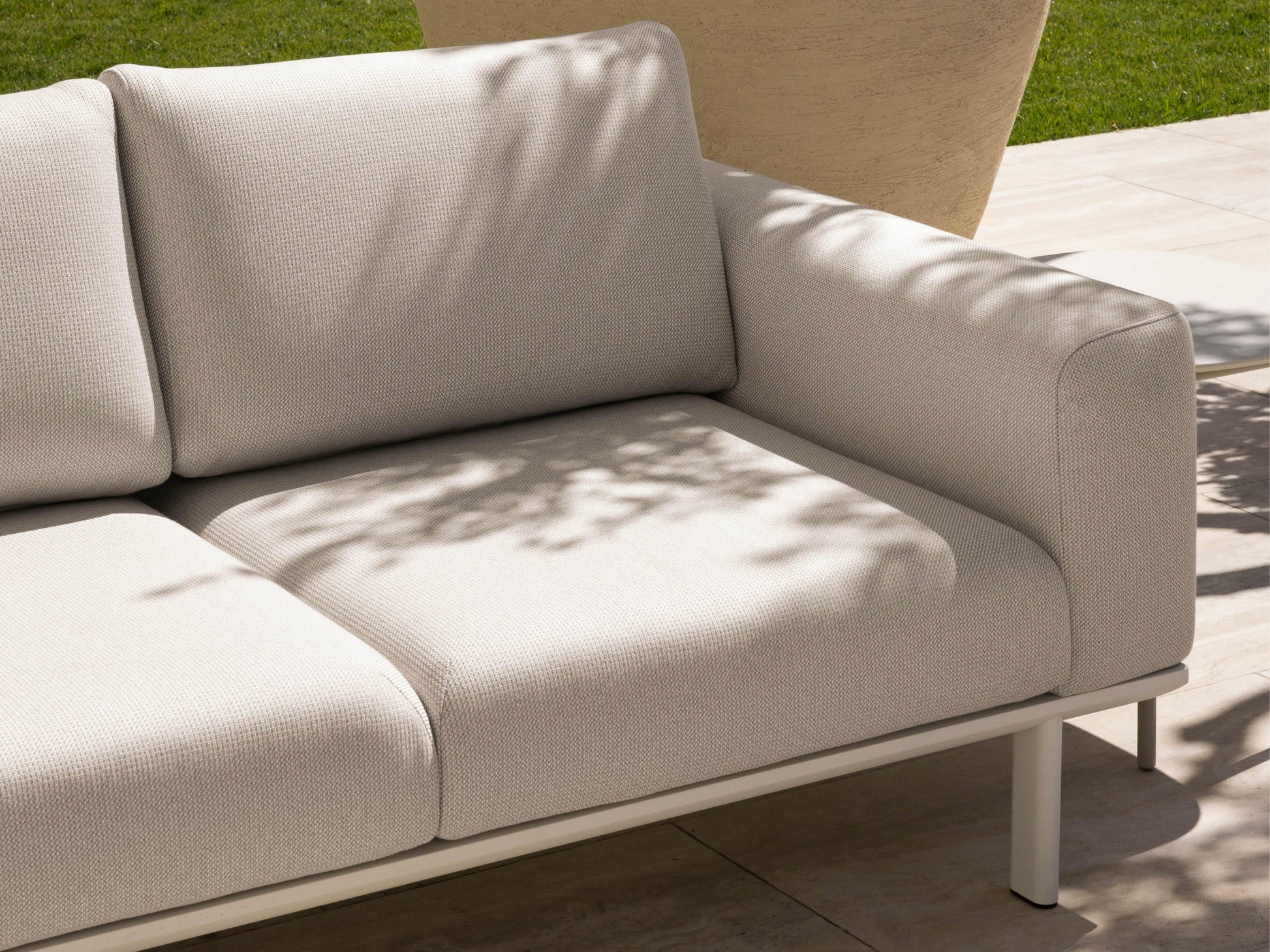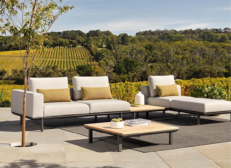 Une plage de sable blanc s'étend des eaux peu profondes émeraude aux falaises de grès et aux plateformes rocheuses. L'Addis est un canapé d'extérieur résistant aux intempéries, avec des tables basses en teck ou en céramique au choix.