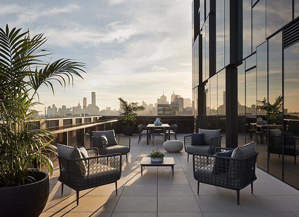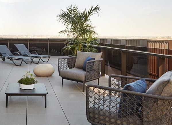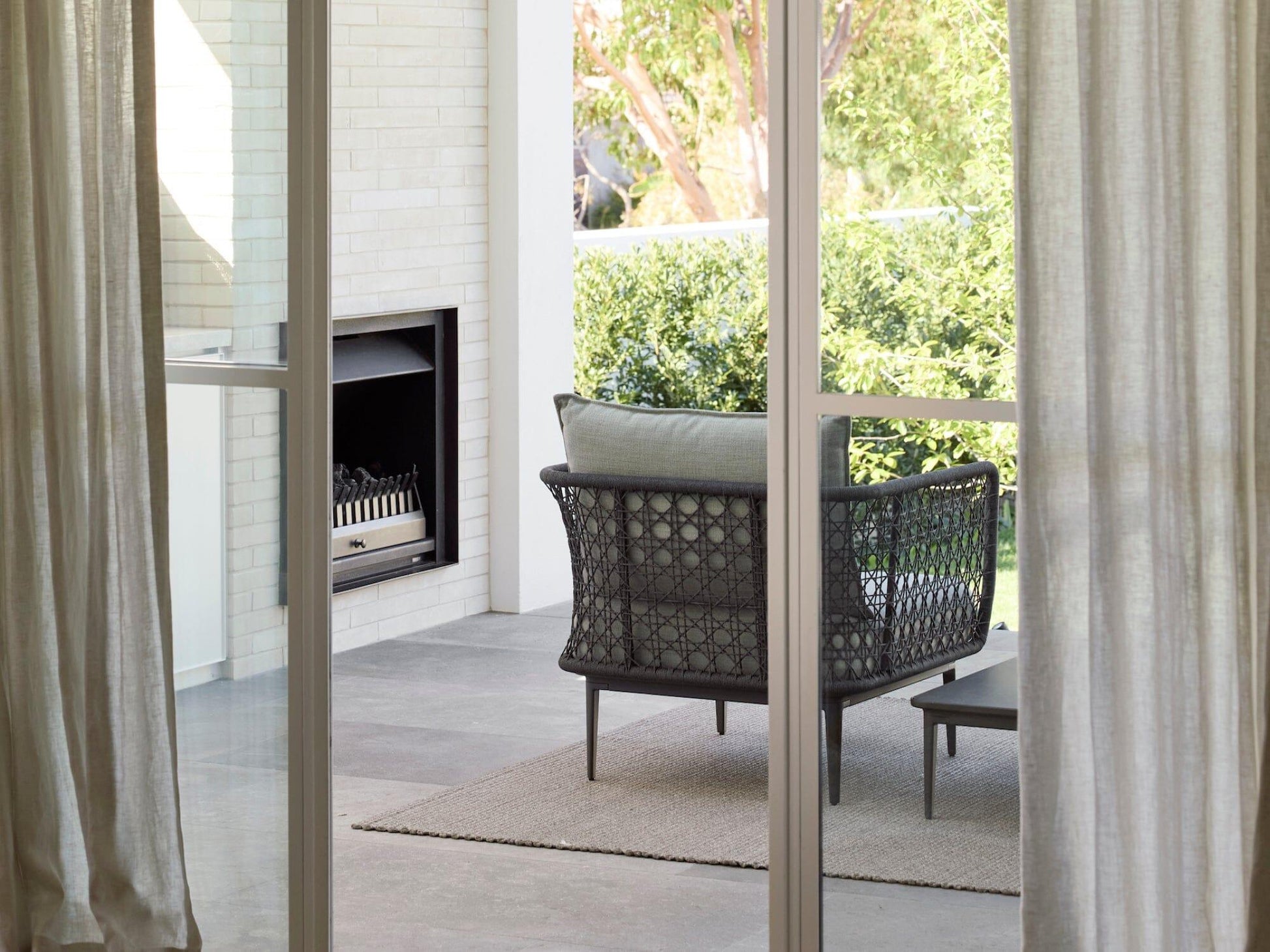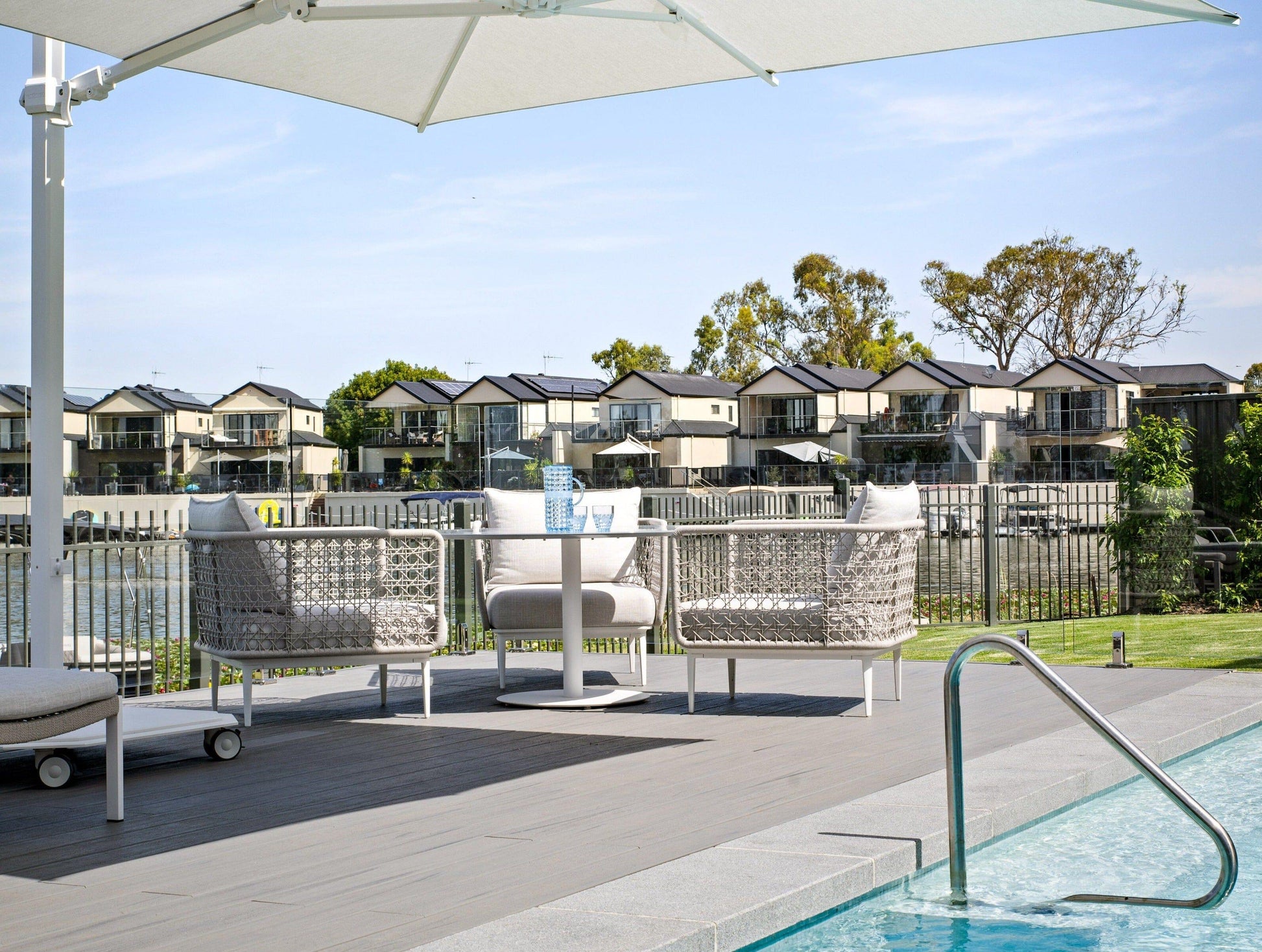 Le mobilier s'inspire des paysages naturels australiens. Les lignes épurées de la collection sont conçues pour résister aux intempéries, avec des structures en aluminium thermolaqué et des tissus résistants aux intempéries.