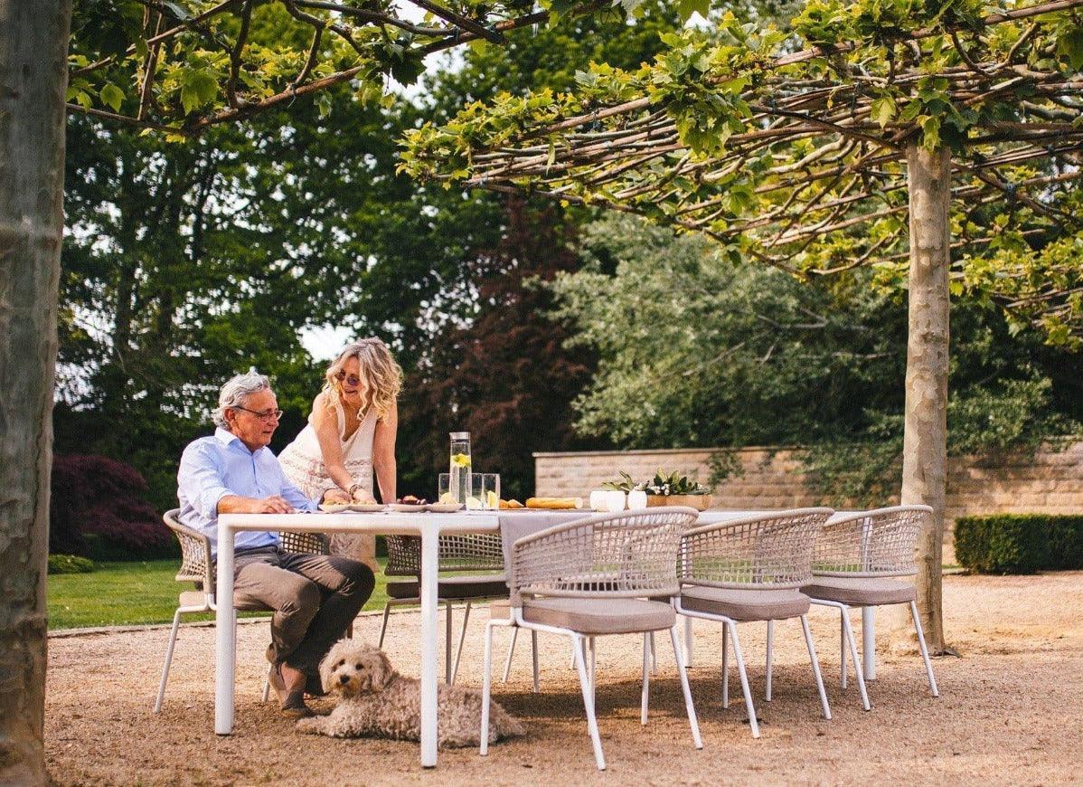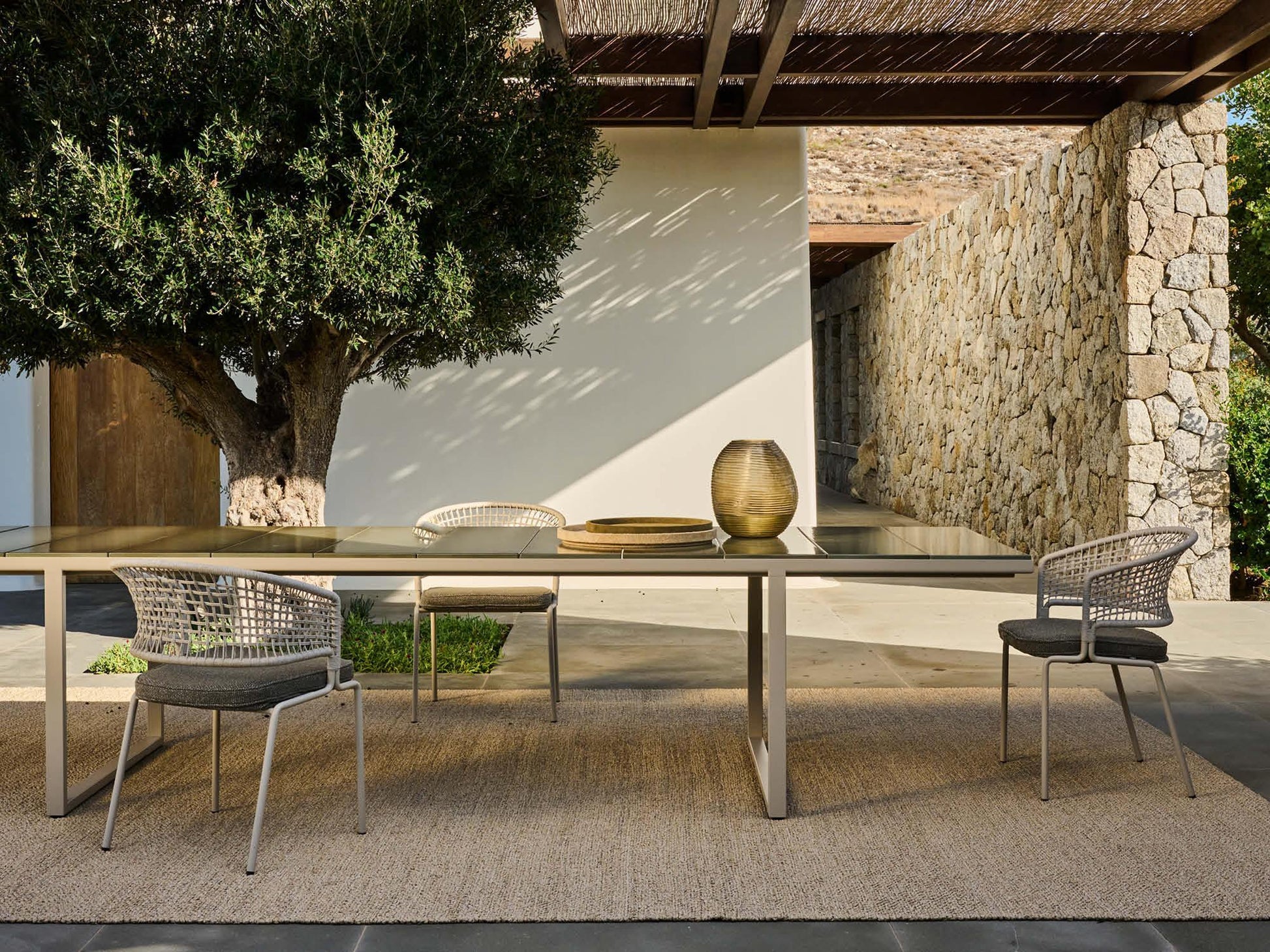 Ce fauteuil d'extérieur se distingue par un tube en acier inoxydable thermolaqué qui épouse parfaitement les contours du fauteuil. Le tressage ajouré du dossier semble flotter autour de l'assise. Ce tressage résistant aux intempéries, en Tricord, offre un soutien optimal à la cambrure du dos. Les assises sont revêtues sur place d'un tissu d'extérieur au choix et sont facilement déhoussables et lavables.