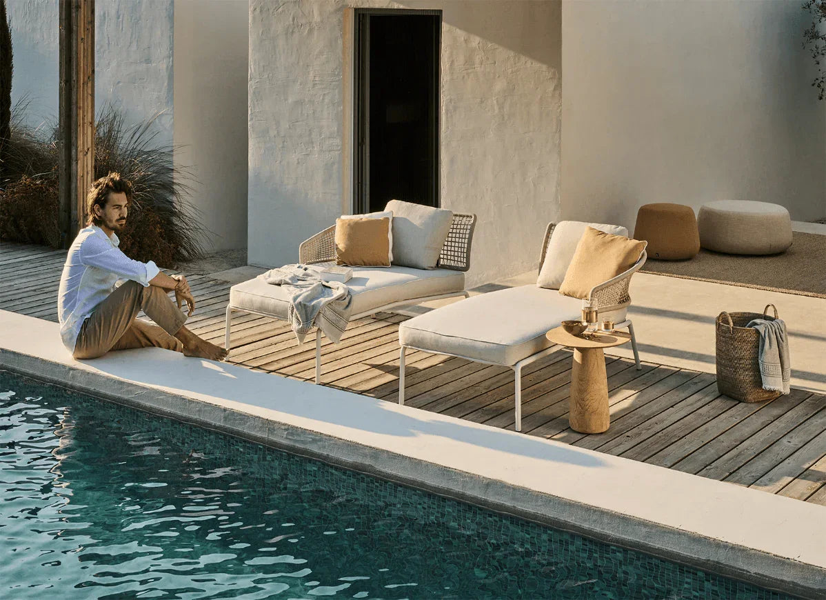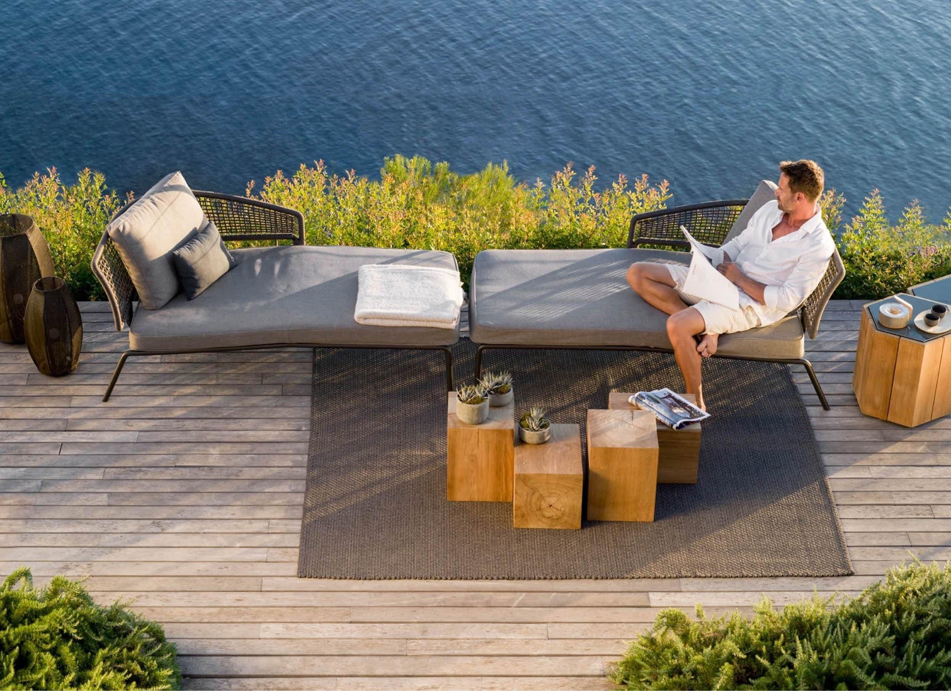 Le tissage ajouré du dossier semble flotter autour de l'assise et offre un soutien lombaire optimal. L'assise est revêtue localement d'un coussin hydrofuge facilement amovible pour le nettoyage.