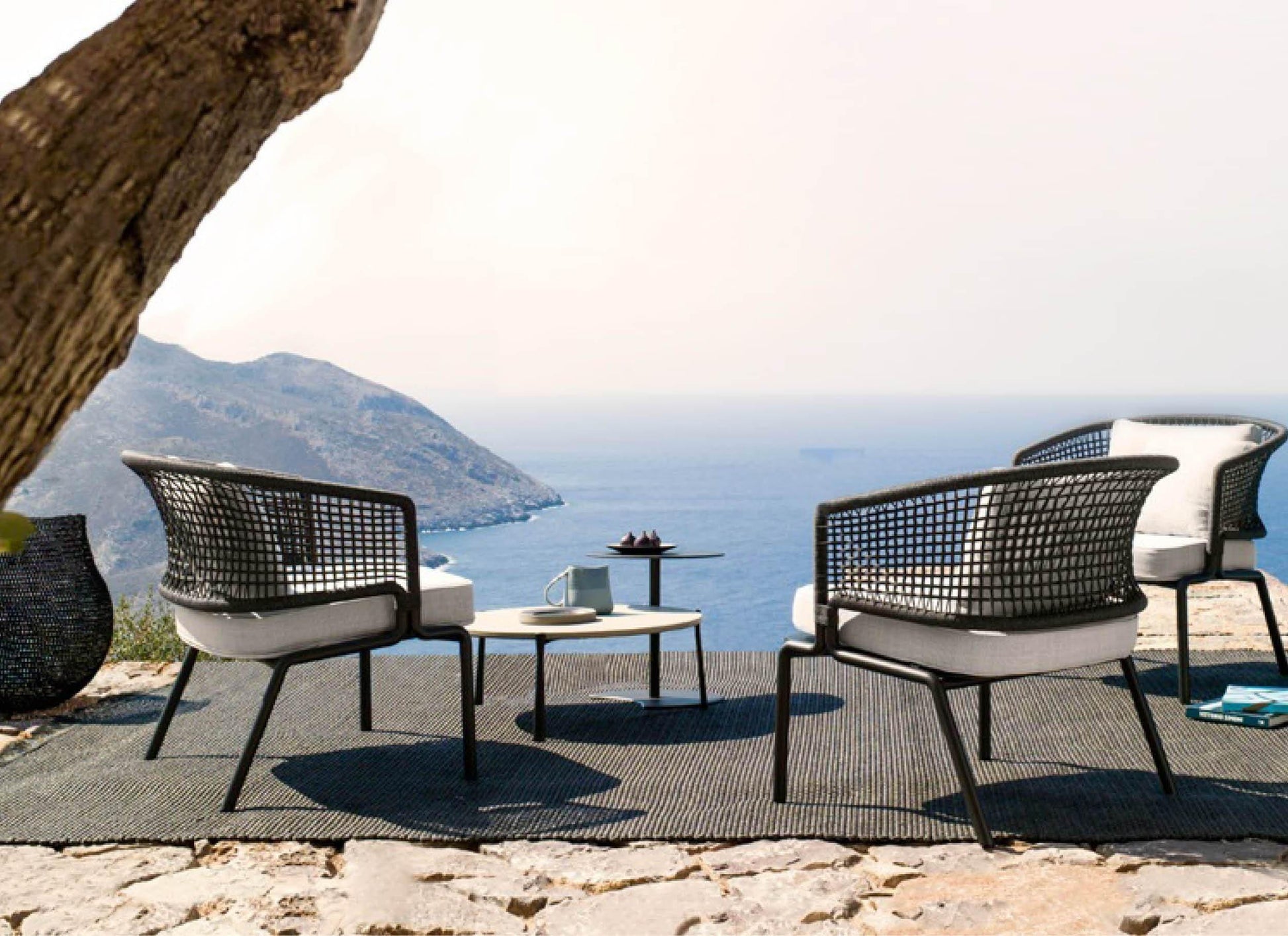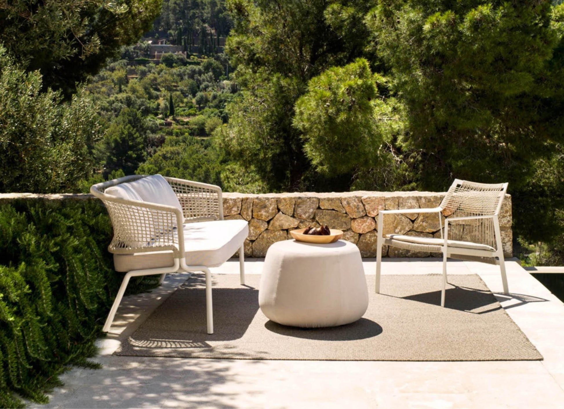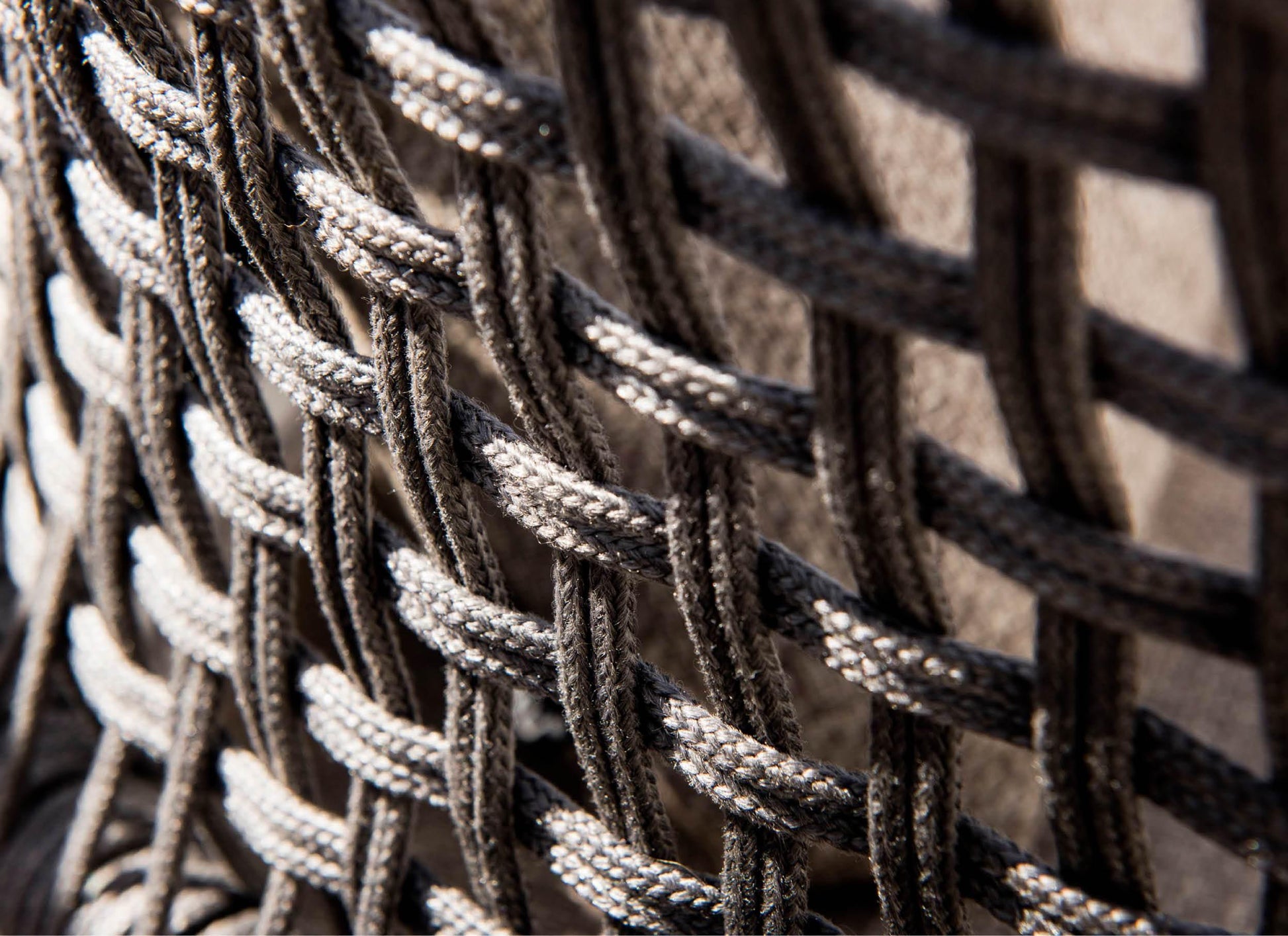 Le nom de ce canapé d'extérieur provient de la silhouette élégante et continue de sa structure en aluminium thermolaqué. Un tube épouse les contours du meuble en une ligne ininterrompue ; un design complexe d'une apparente simplicité. Les dossiers, en Tricord résistant aux intempéries, sont recouverts d'un magnifique tressage ajouré qui semble flotter au-dessus des assises.