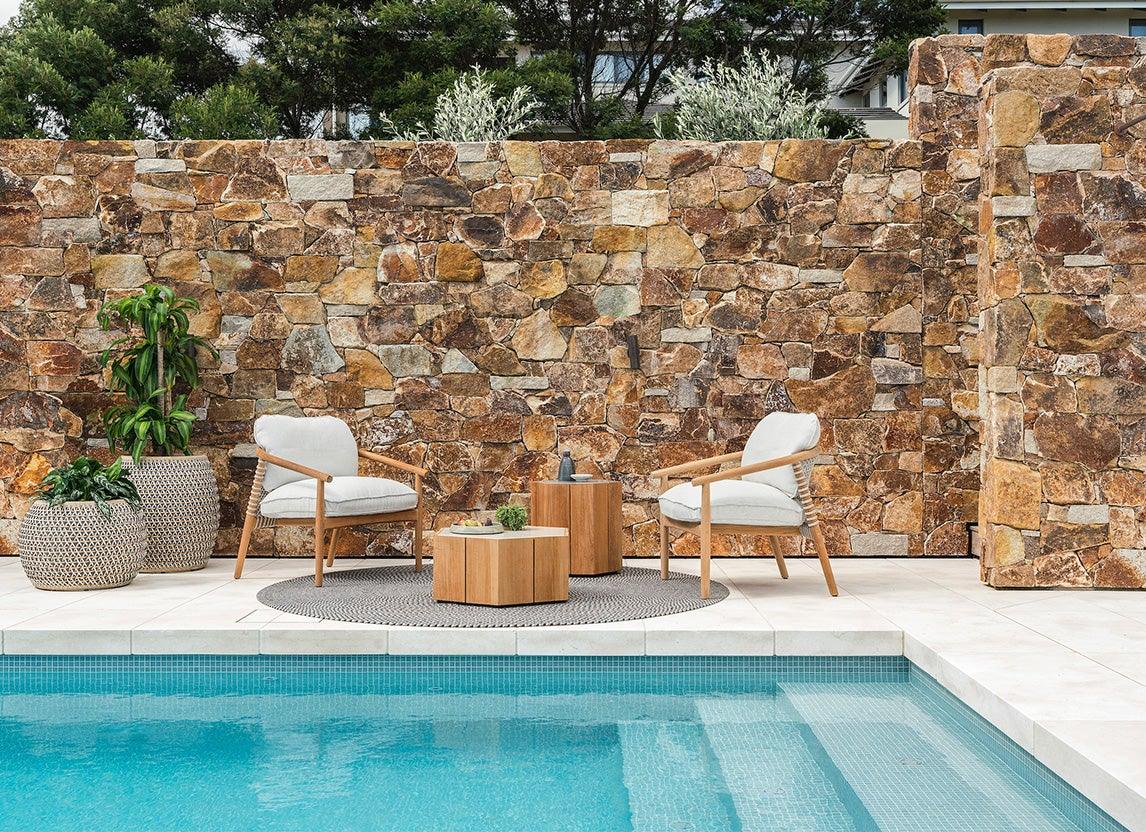 Une terrasse donnant sur l'extérieur, le mobilier faisant office de médium – ici, le romantisme des montagnes lointaines et des champs verdoyants se mêle au confort décontracté du foyer.