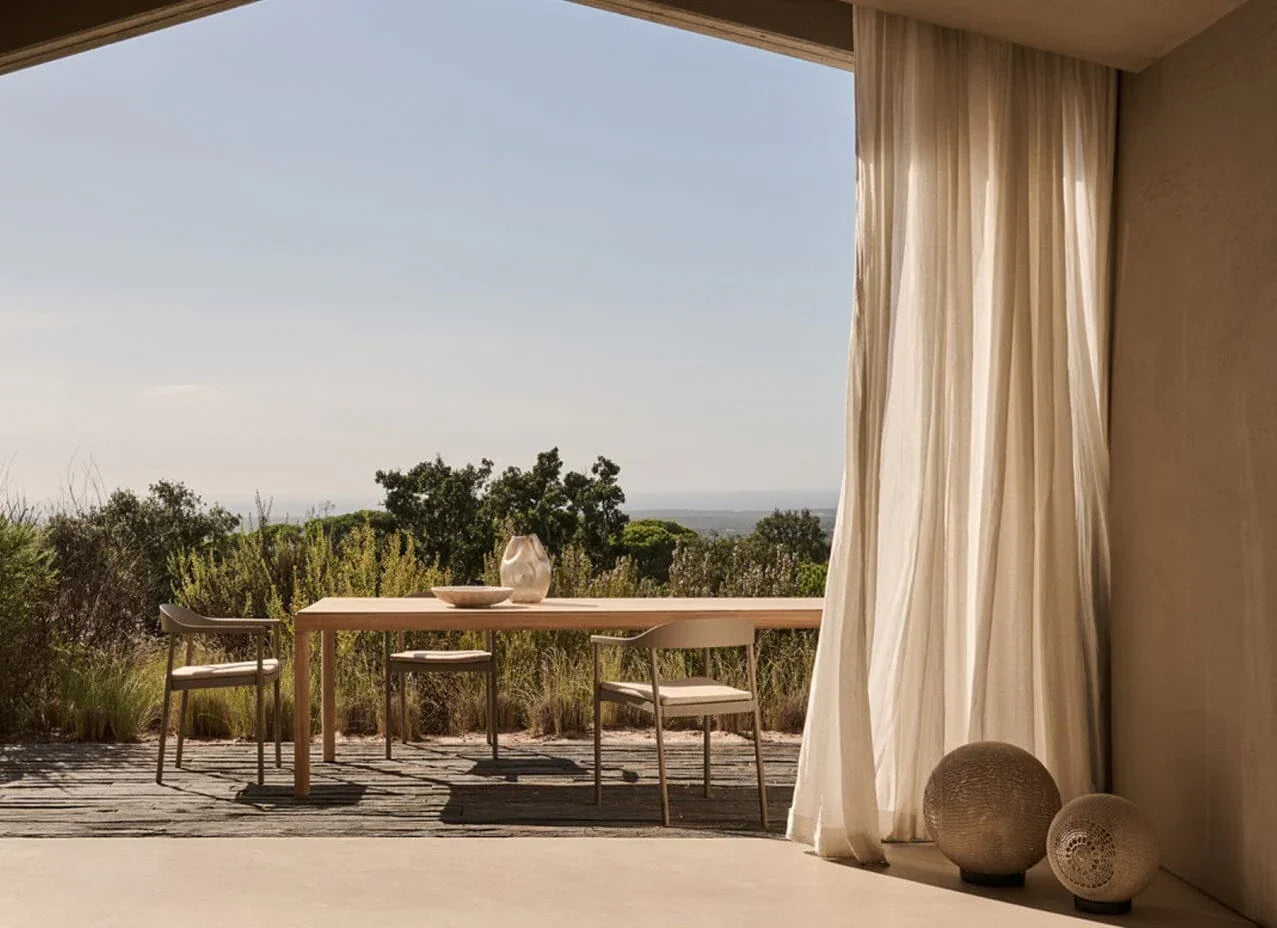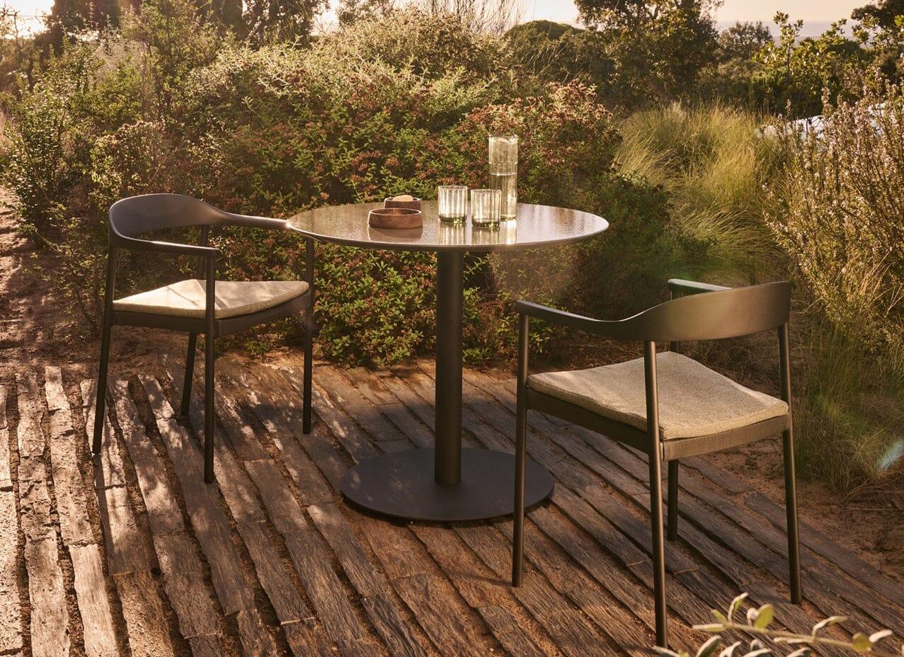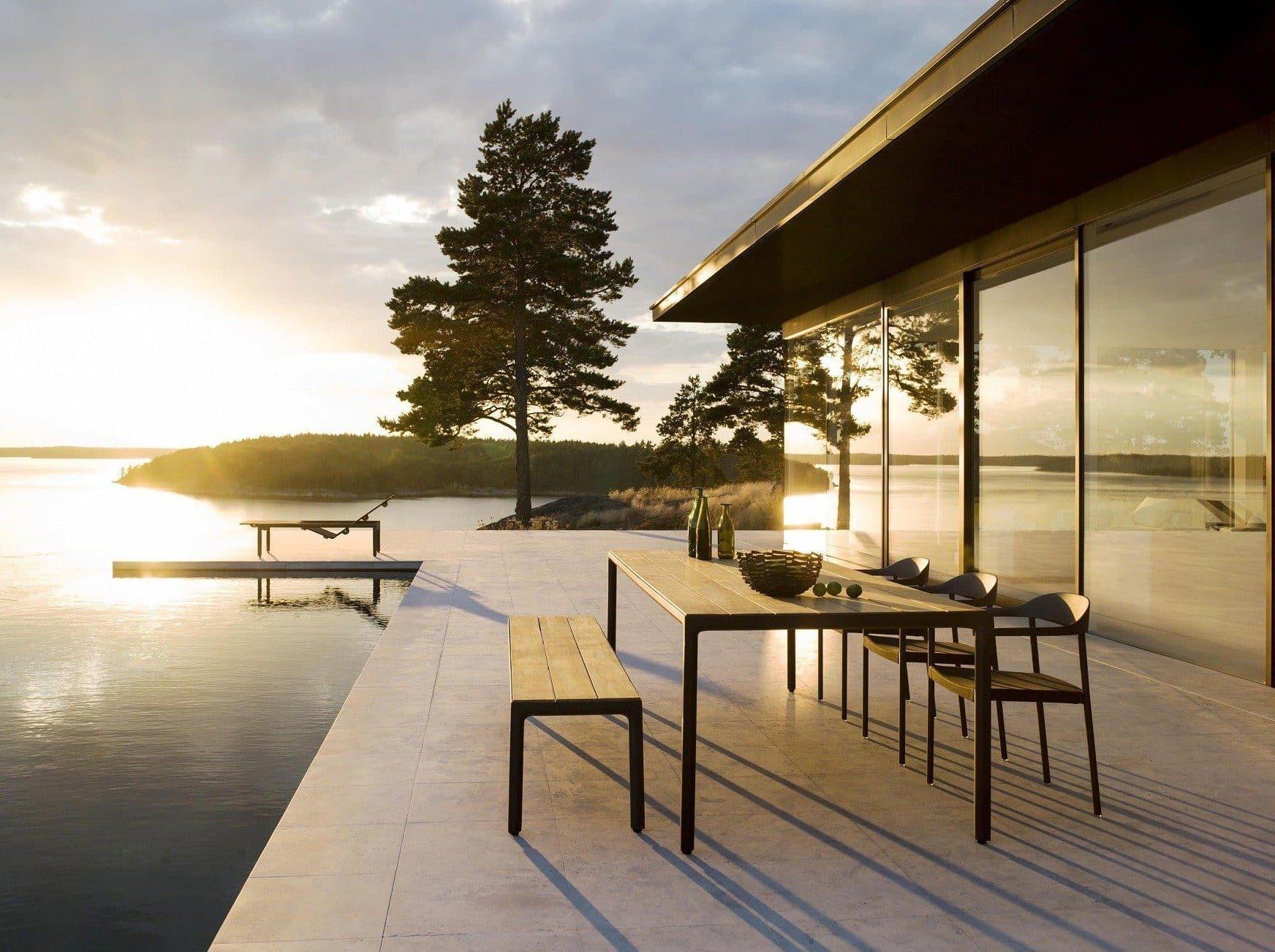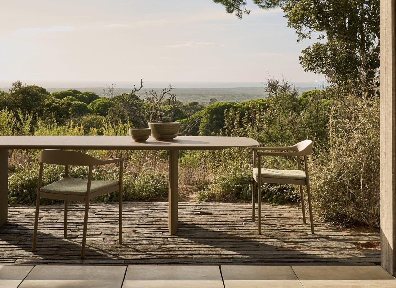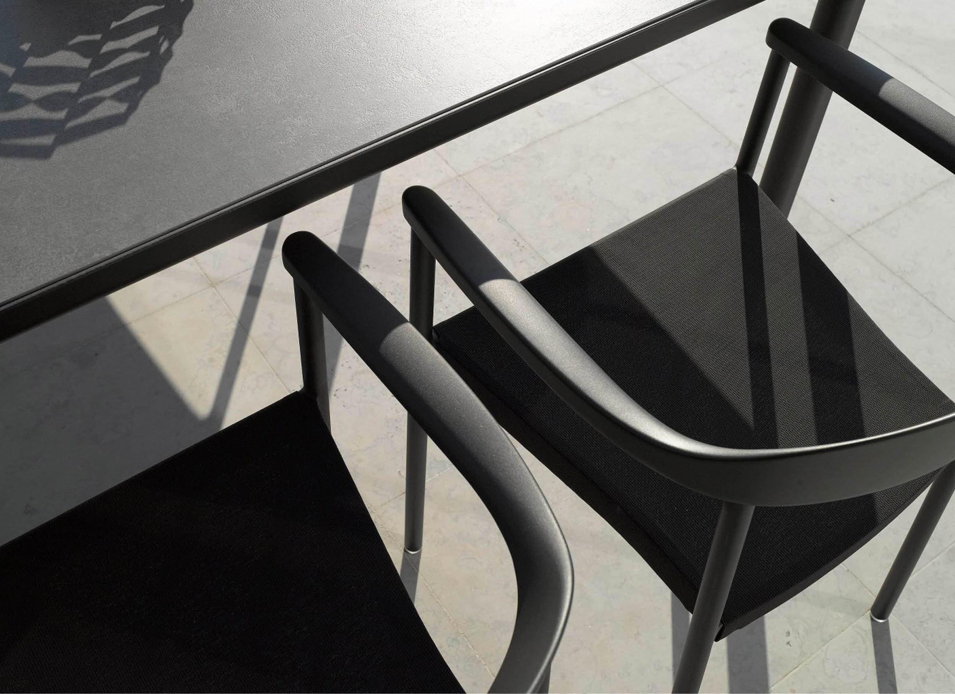 Le fauteuil s'inspire des archétypes classiques du mobilier scandinave, réinterprétés avec des matériaux modernes adaptés à l'extérieur. L'aluminium, tel un bois sculpté, est utilisé dans toute la collection, créant des transitions harmonieuses entre lignes nettes et douces.