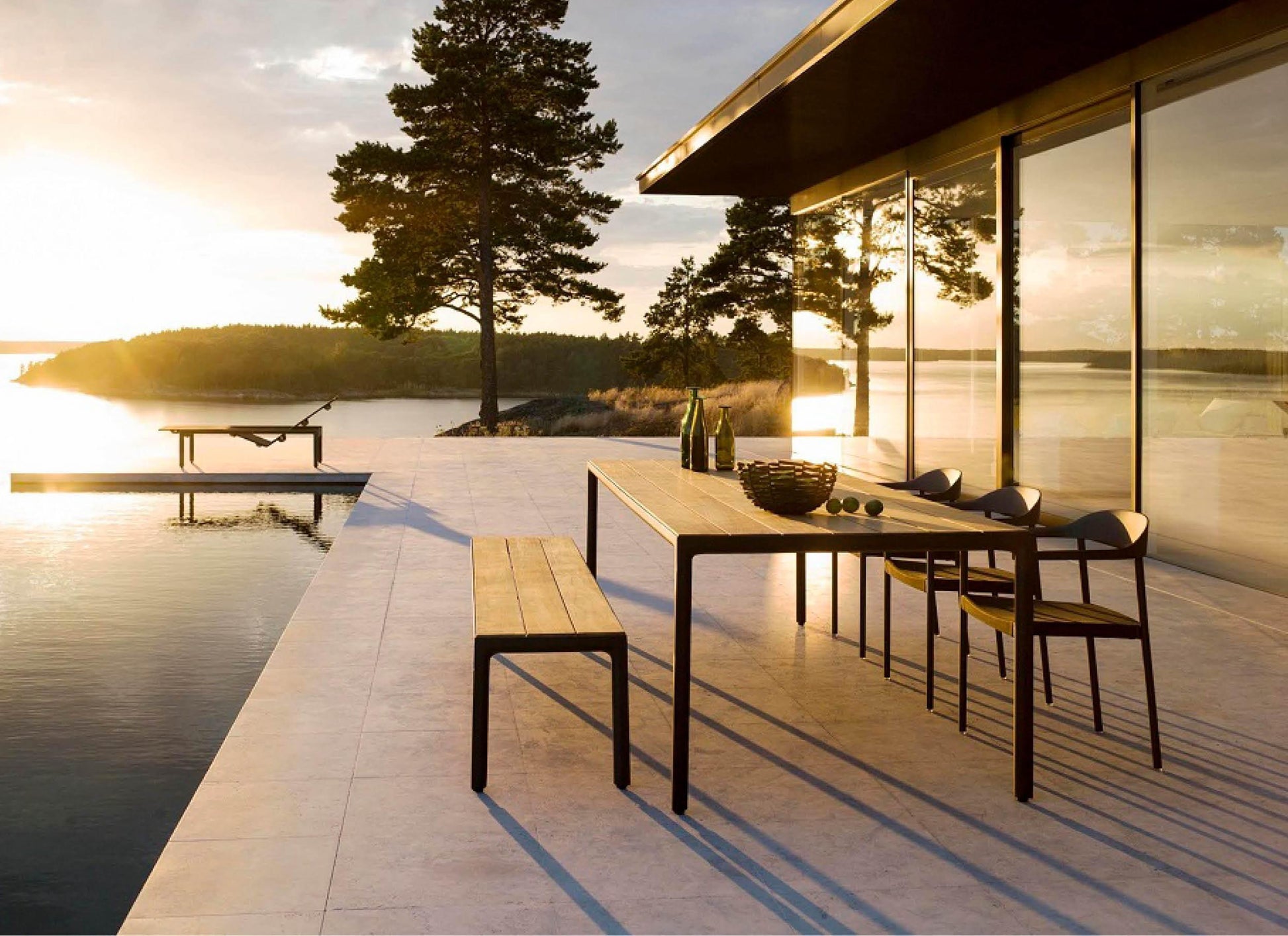 Ce banc d'extérieur associe l'aluminium au bois sculpté, avec des transitions harmonieuses entre lignes douces et nettes. Le plateau en teck chaleureux contraste élégamment avec la robuste structure en aluminium, et des coussins d'assise de fabrication locale peuvent être ajoutés pour une personnalisation optimale.