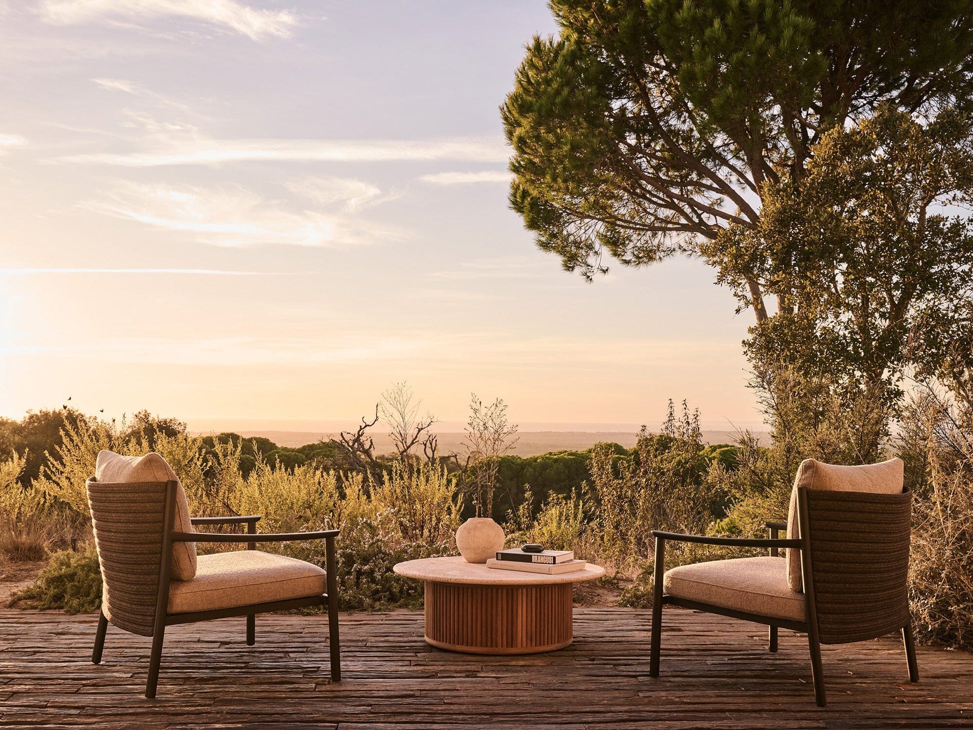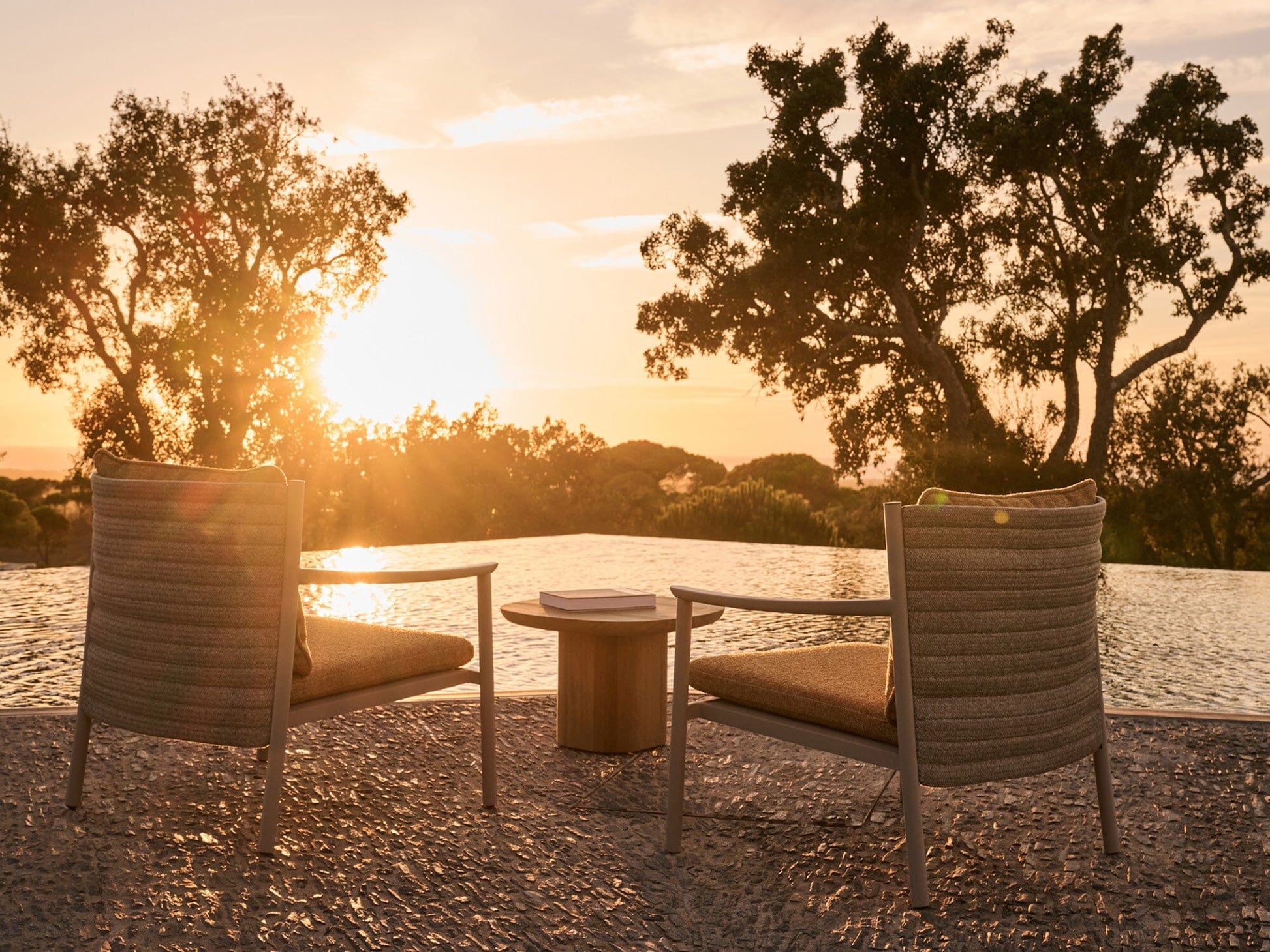 L'élégante silhouette de ce fauteuil s'inspire de la calligraphie japonaise, tandis que ses accoudoirs incurvés offrent un confort enveloppant. Le dossier tissé, inspiré des traditions du Sud des États-Unis, est composé d'une large bande de tissu Canax® tricoté, superposée à une mousse EPDM résistante aux intempéries. Cette conception dissimule astucieusement la structure en aluminium et confère au fauteuil une allure légère et aérée. Le cœur en fibres souples assure au dossier une douce élasticité, garantissant un confort optimal en toute circonstance.