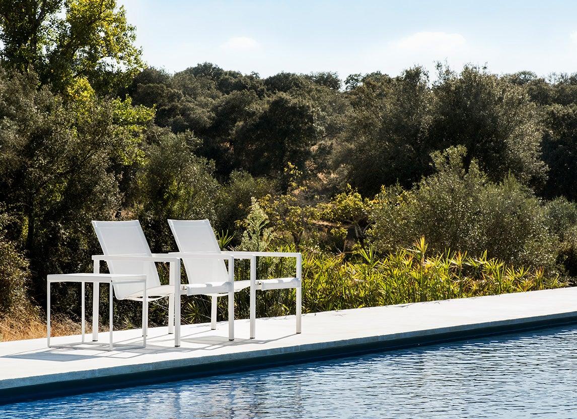 La collection d'extérieur présente une structure angulaire et une assise incurvée qui semble flotter. Les angles arrondis des accoudoirs confèrent à ces chaises d'extérieur une allure plus douce et féminine.