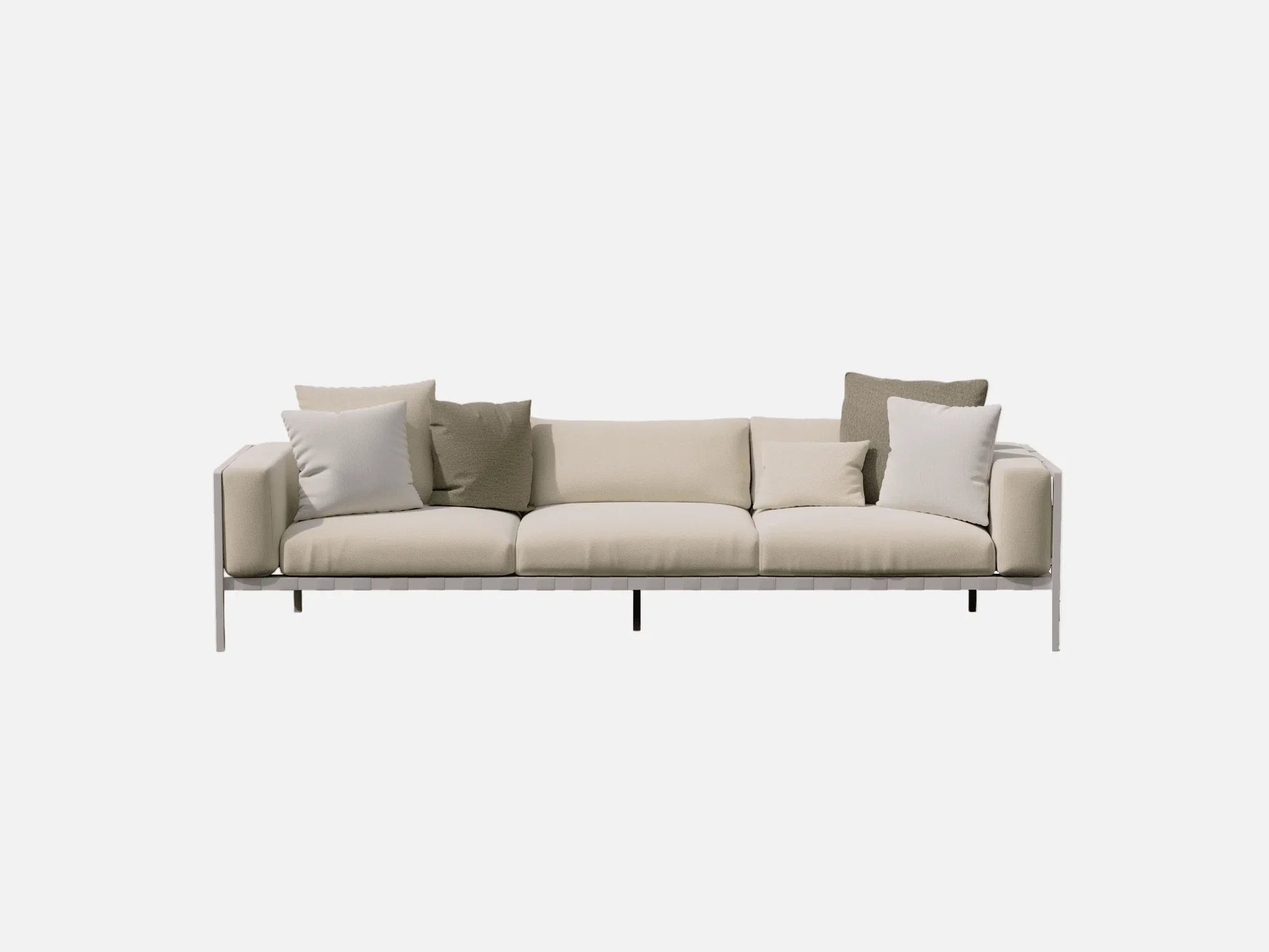 La structure épurée et les accoudoirs élégamment incurvés contrastent harmonieusement avec les coussins d'extérieur, tandis que de larges bandes en tissu Teslin assurent un bon maintien. Le canapé en aluminium Natal, à la fois classique et élégant, s'intègre parfaitement à tous les styles de jardins et d'espaces piscine.