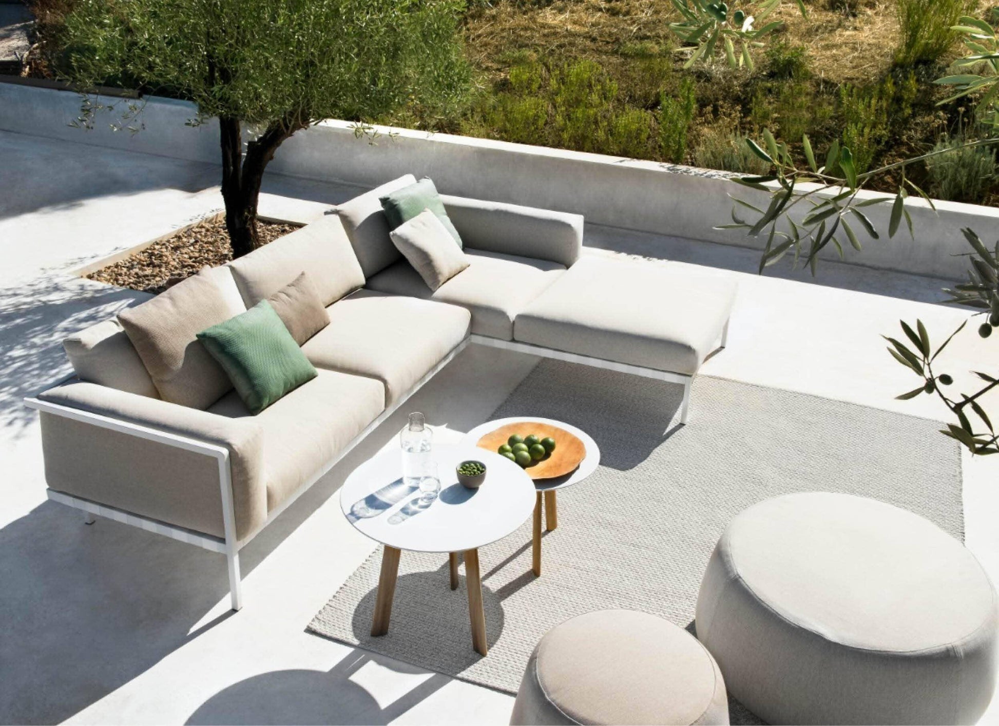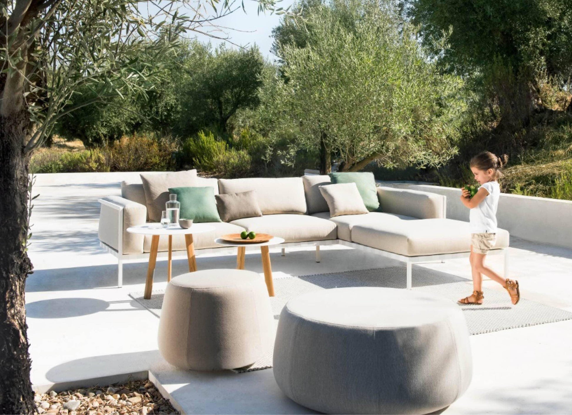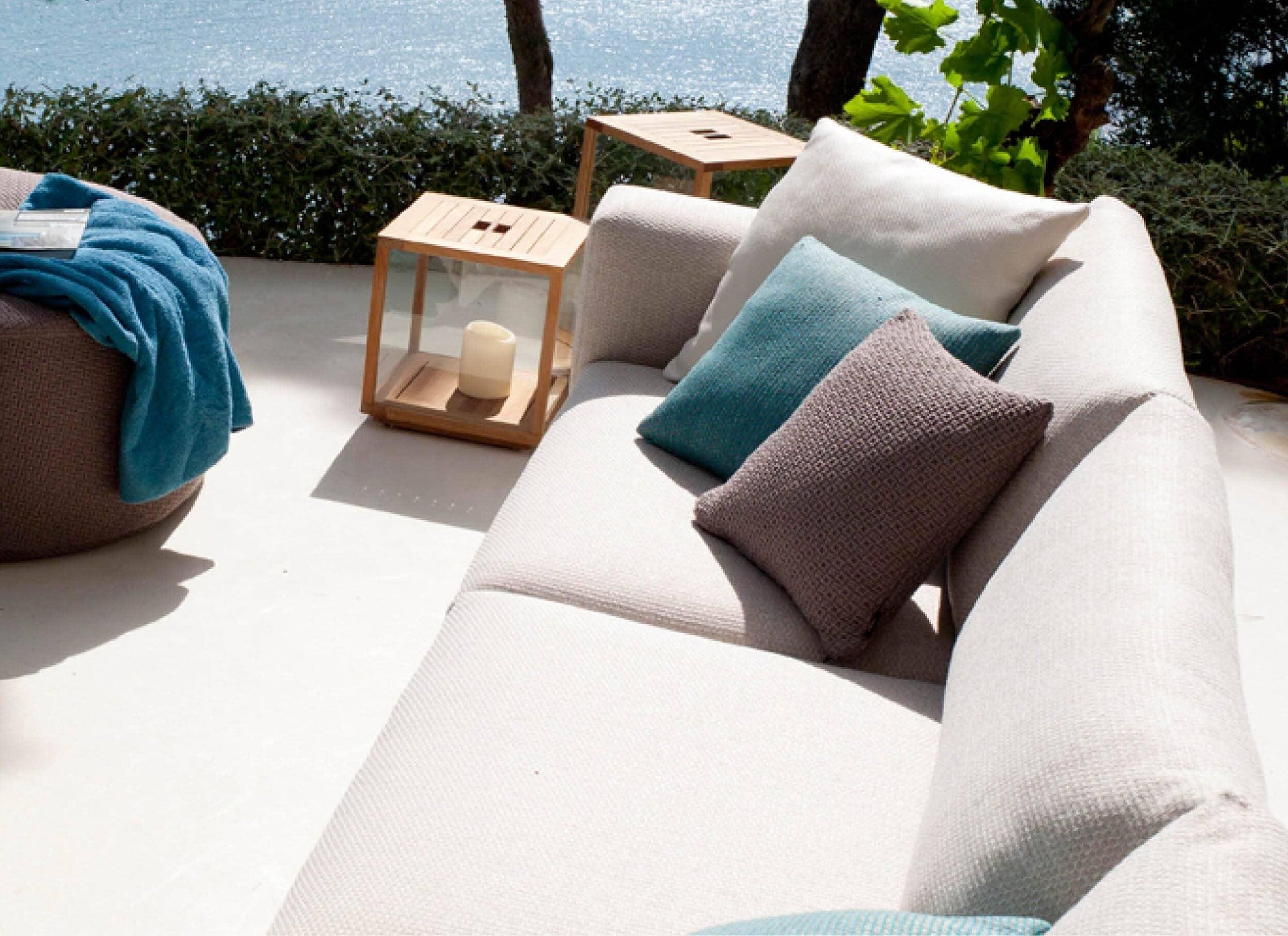 Une attention particulière est portée aux coussins d'extérieur, conçus pour rester dehors pendant toute la saison. Leur garnissage ventilé sèche rapidement et est résistant à l'eau. Toutes les housses sont confectionnées dans un tissu d'extérieur haut de gamme, garanti contre la décoloration et la détérioration.