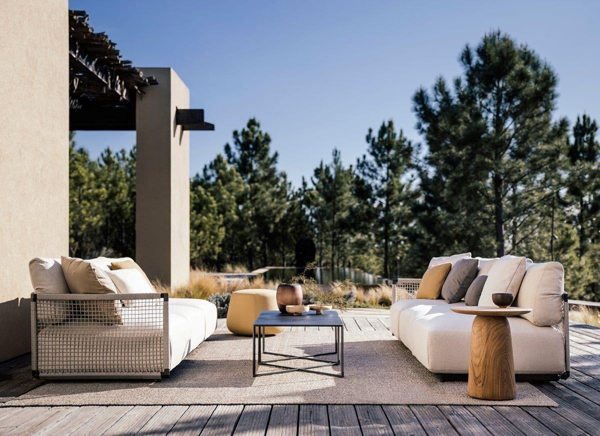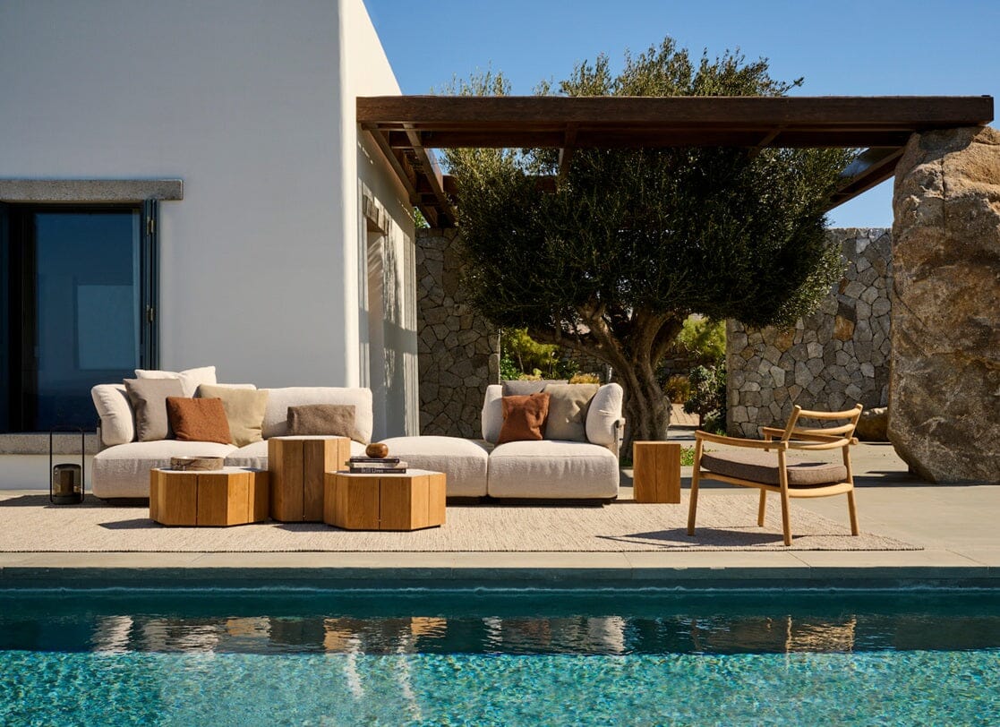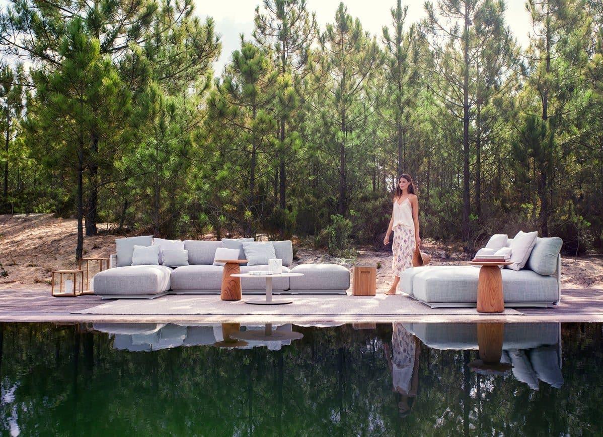 Ce canapé modulable, au profil affirmé et à la personnalité discrète, s'intègre parfaitement dans un espace extérieur sans l'envahir. Sa structure élégante repose délicatement sur le sol, tout en étant réalisée en acier inoxydable massif thermolaqué.