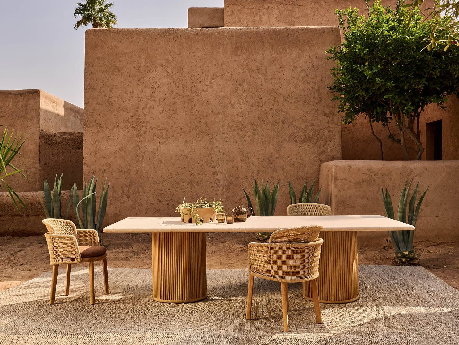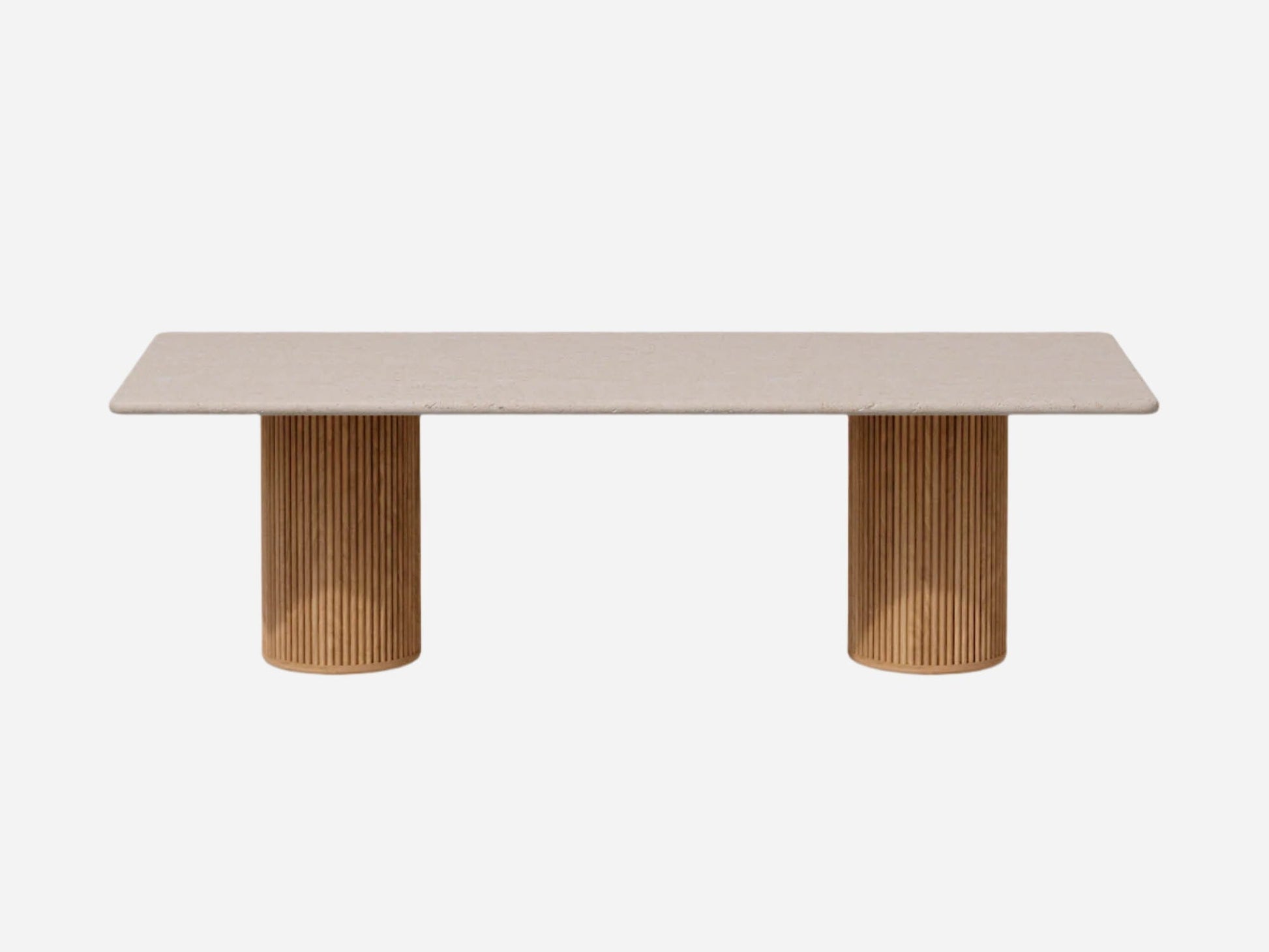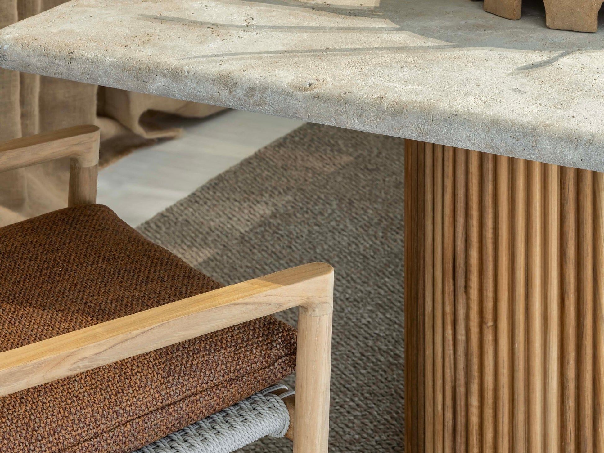 Plateaux de table : teck, céramique ou travertin – une pierre naturelle captivante aux textures uniques et aux applications polyvalentes.