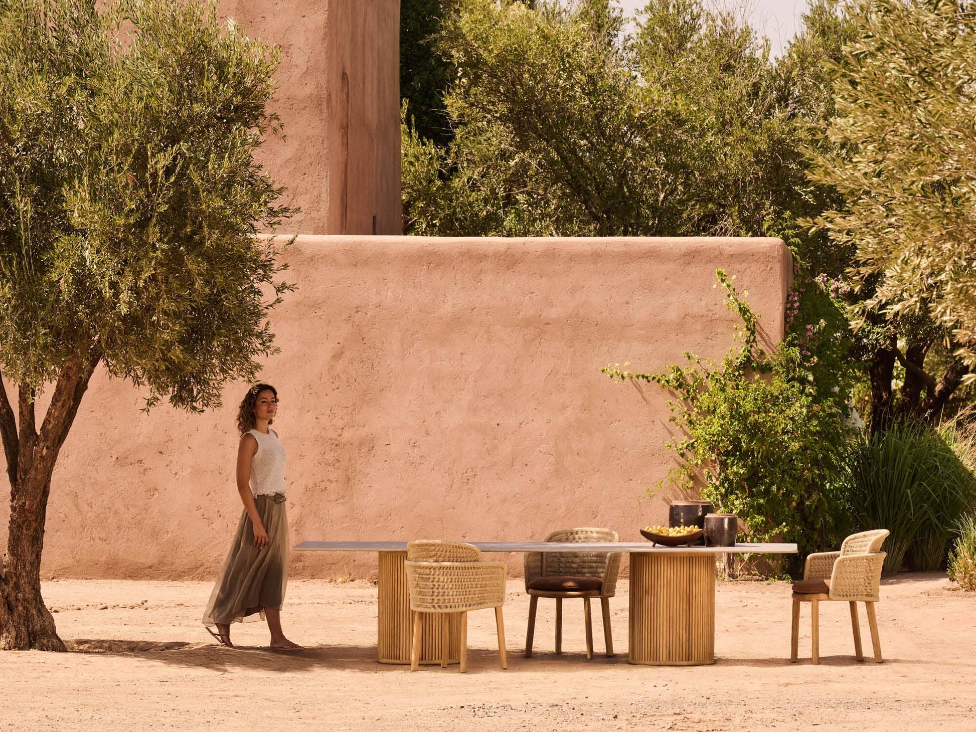 Cette collection s'inspire du motif rythmique en « ruban » que l'on retrouvait souvent sur les comptoirs de bars italiens des années 1940. À l'instar d'anciennes colonnes architecturales, des bases robustes mais élégantes, ornées de motifs, soutiennent des plateaux de table suspendus, ronds ou rectangulaires, disponibles en céramique ou en travertin naturel pour une durabilité et un charme intemporel dans divers environnements extérieurs.