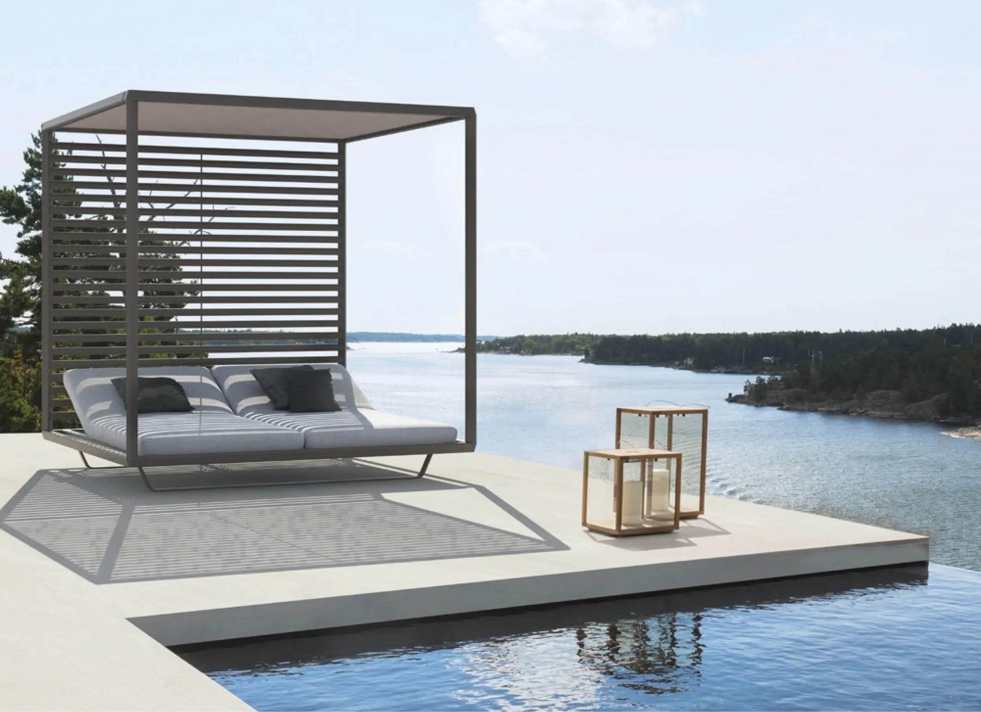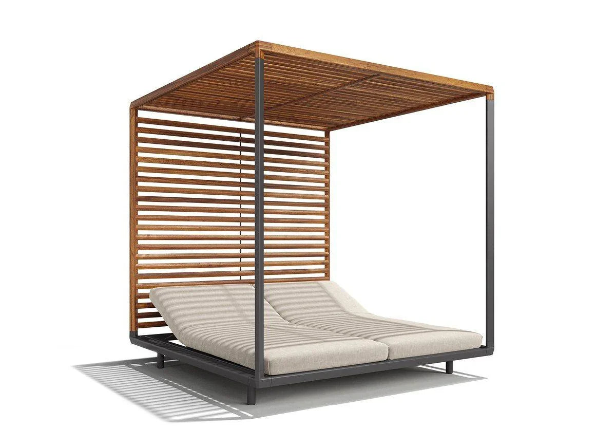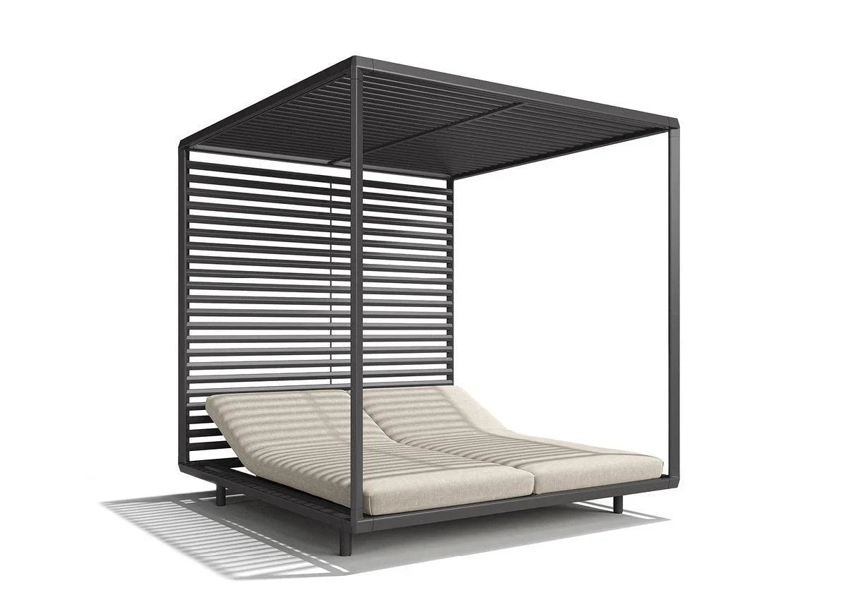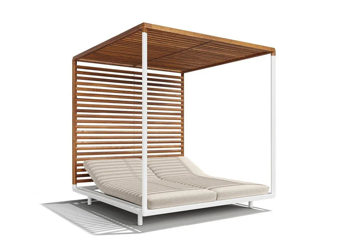 Le lit de jour est personnalisable grâce à un choix de voilages et de finitions de peinture. Le dossier et le plafond sont disponibles en lattes de teck, en lattes d'aluminium ou en Sunvision (fibres acryliques et polyester revêtues de PVC). Le toit en Sunvision est orientable pour profiter pleinement du soleil. Le revêtement d'assise ultra-résistant en Batyline peut être utilisé seul ou avec deux coussins d'extérieur confortables et peut être complété par une table d'appoint amovible.
