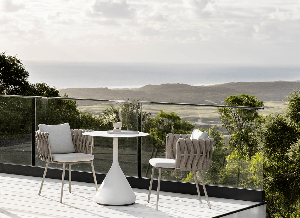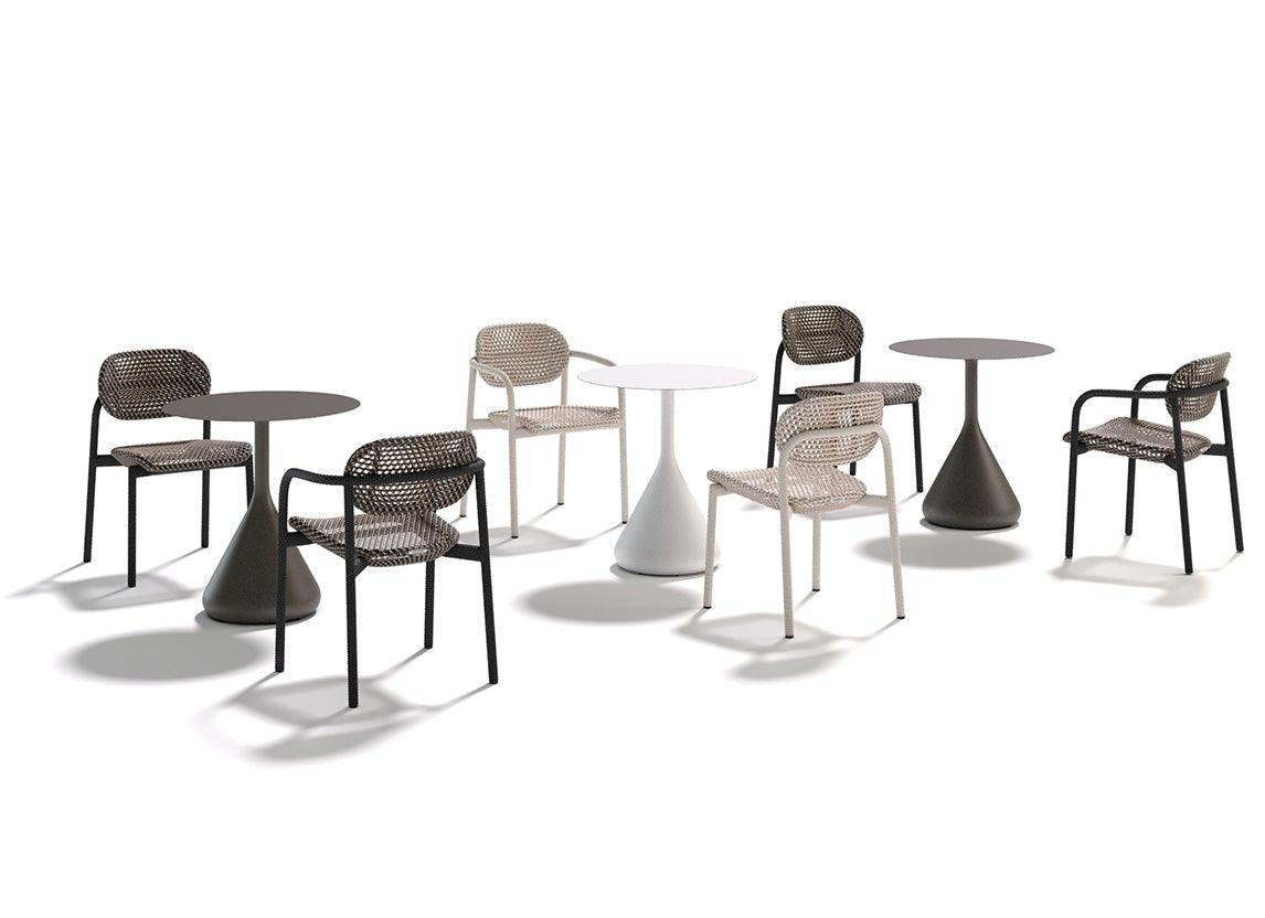 Les tables à manger, d'une élégance sobre, arborent des lignes épurées et un style contemporain. Leur pied central évoque le futurisme, mais elles sont conçues pour être appréciées aussi bien au jardin que sur un balcon.