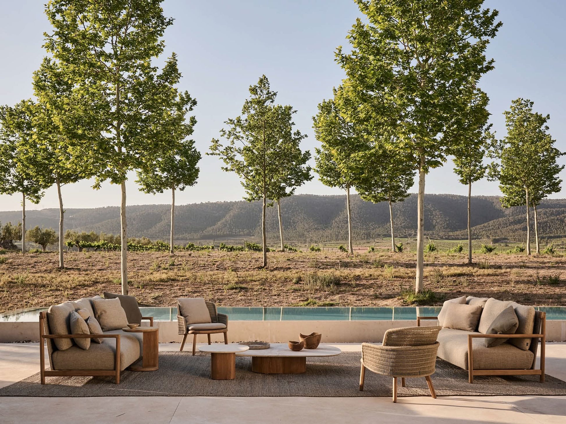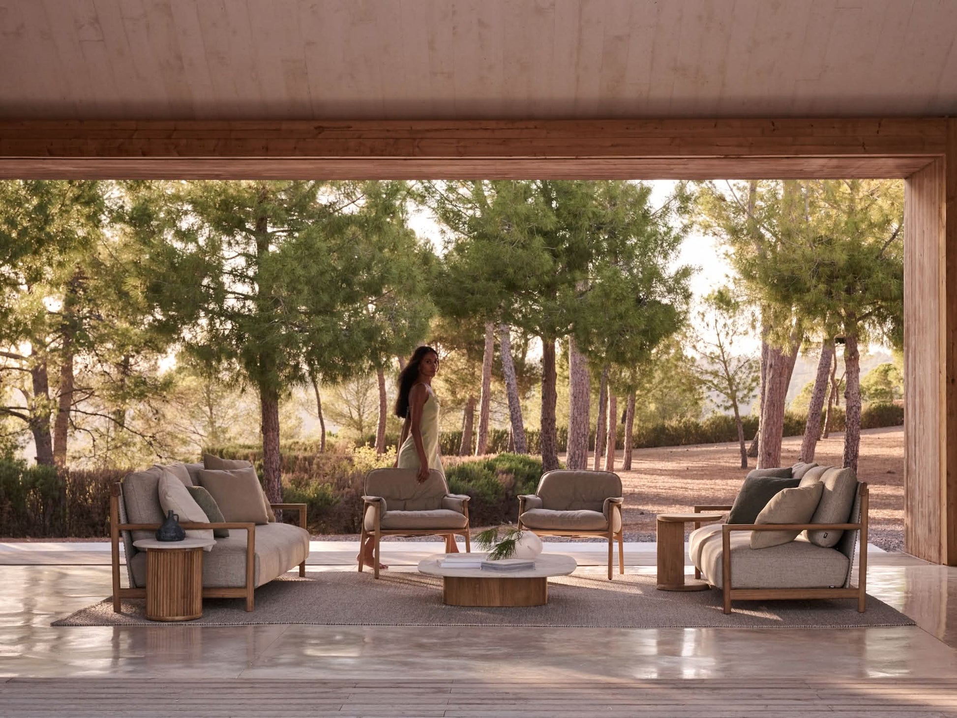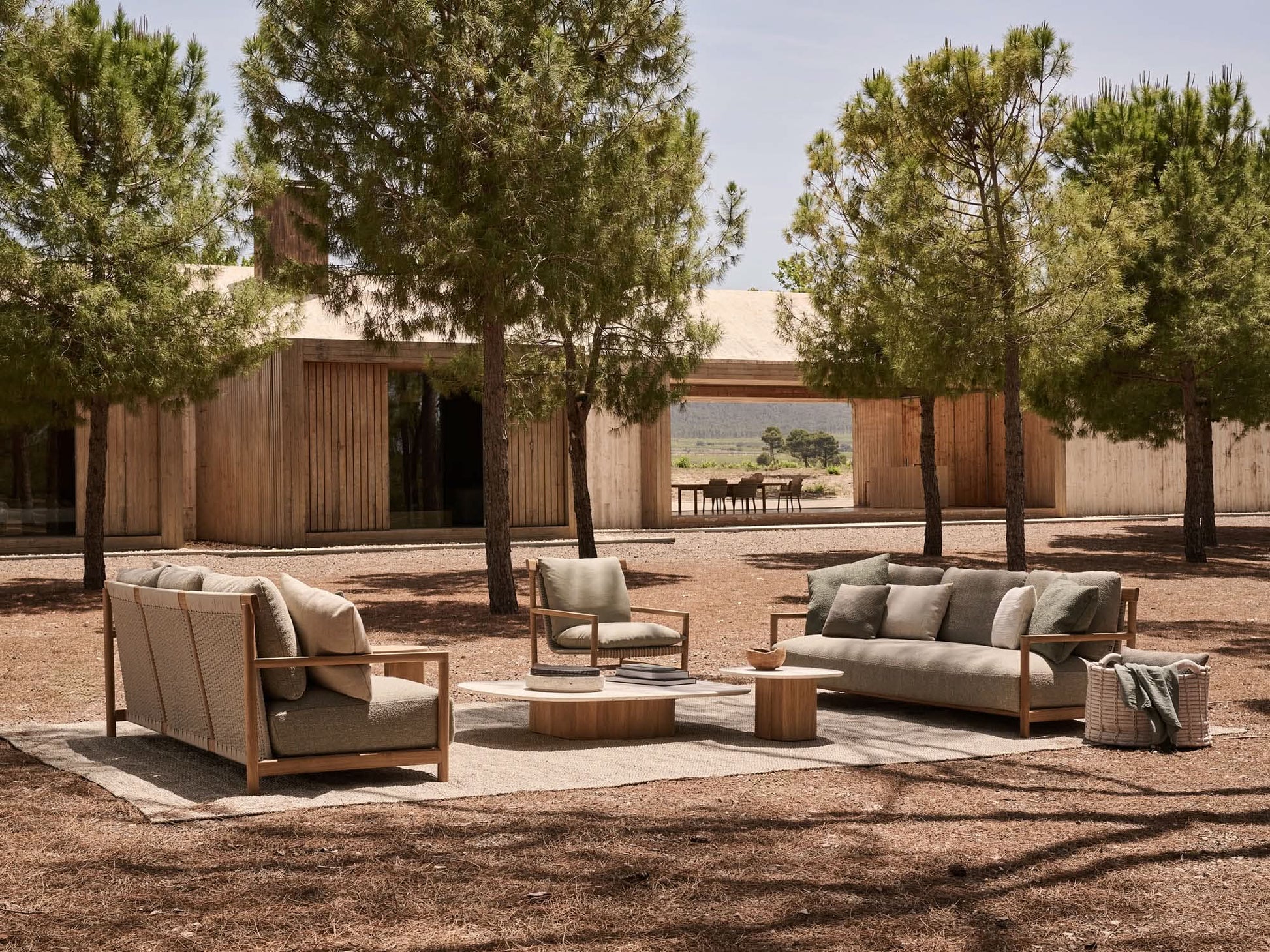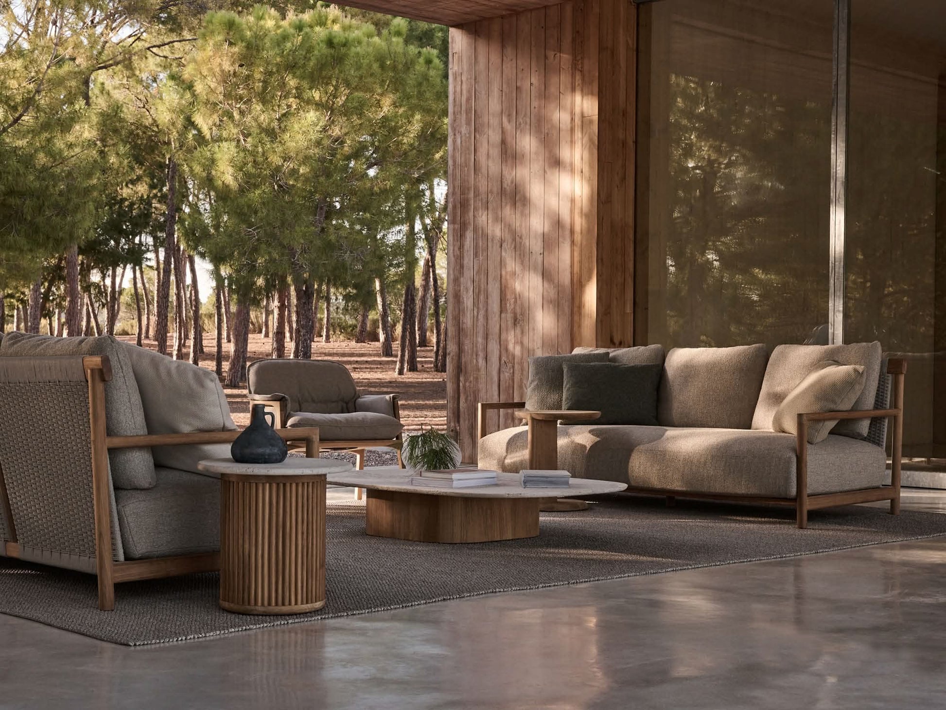 Matériaux : Disponible avec un piètement en aluminium ou en teck, associé à un plateau en travertin ou en céramique.
