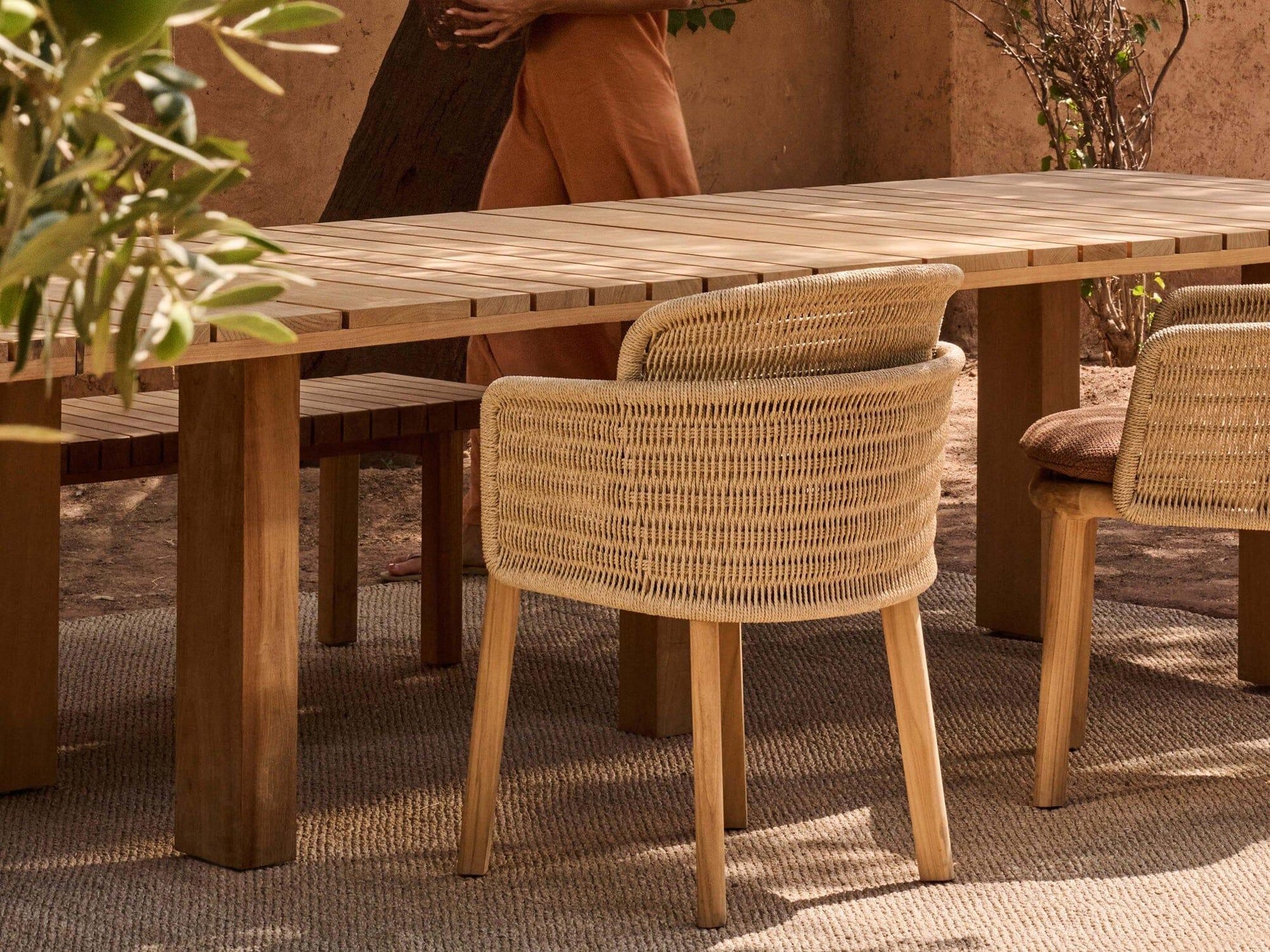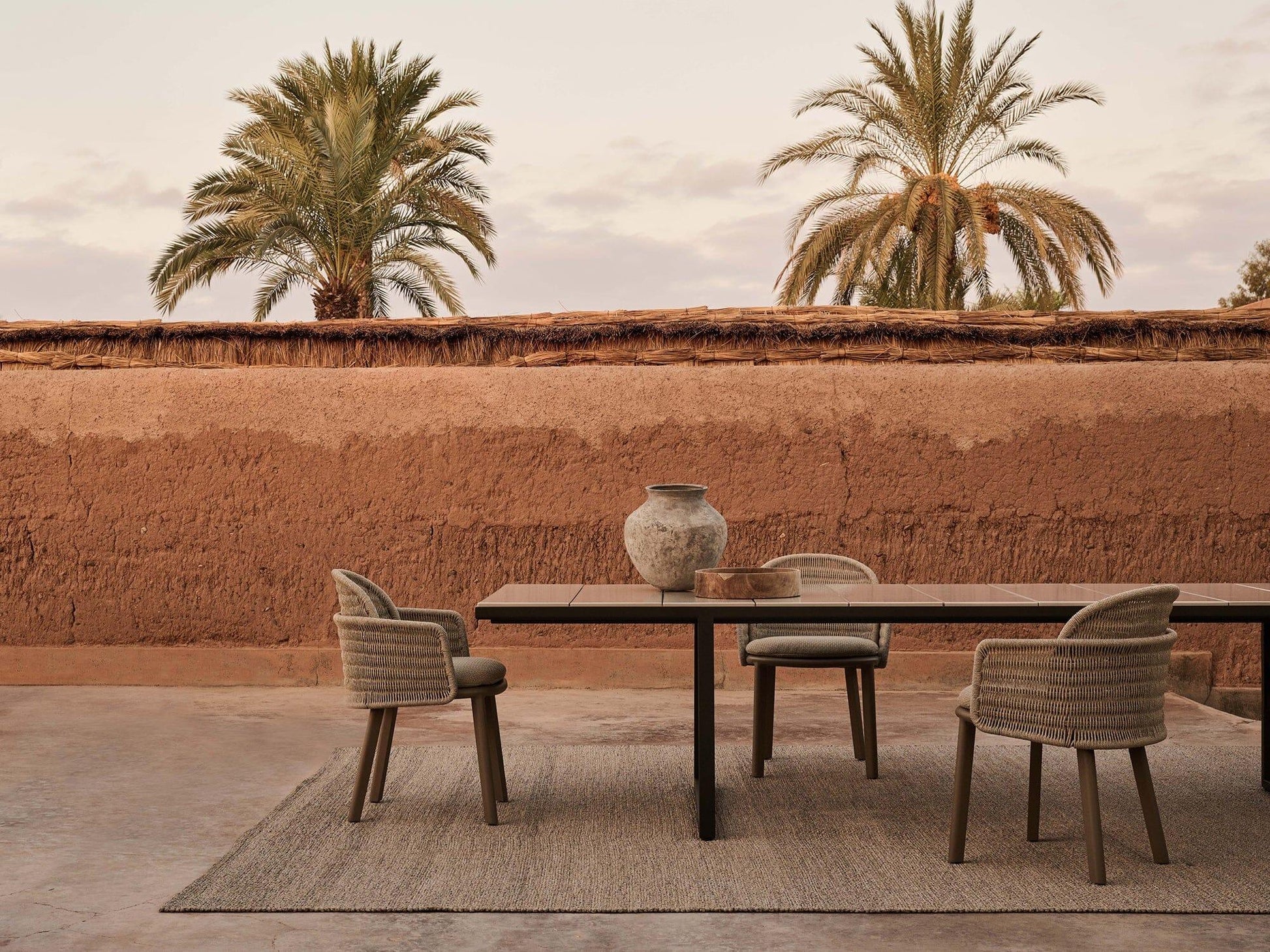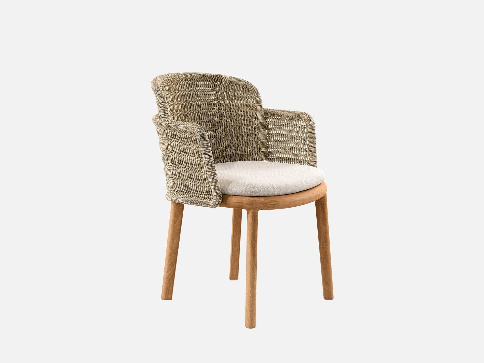 Ce fauteuil allie à la perfection deux matériaux : l'élégante robustesse du teck ou de l'alliage d'aluminium thermolaqué à la souplesse fluide de la corde tressée. Ingénieusement entrelacés, le bois et l'alliage d'aluminium s'unissent pour soutenir la structure de l'assise. Le dossier en fibres semble flotter au-dessus de l'assise, formant une silhouette enveloppante, comme un cocon, dont les courbes offrent un confort exceptionnel.