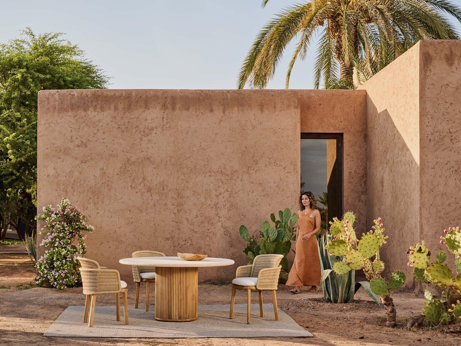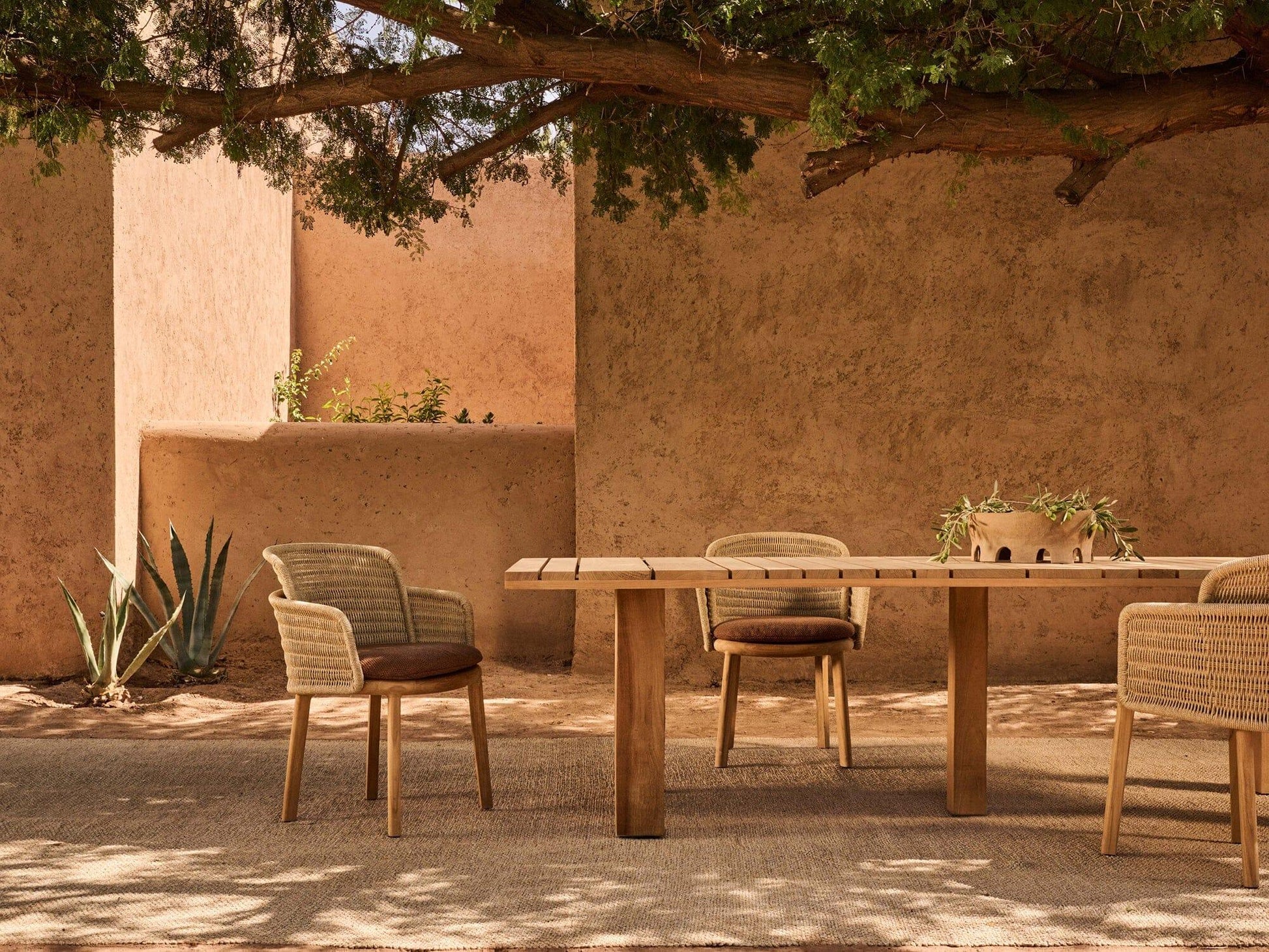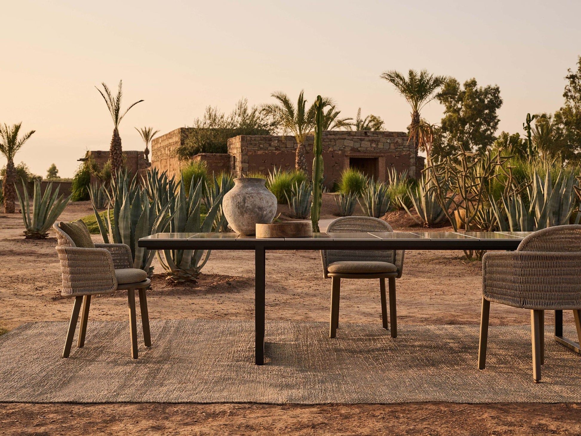 Ce fauteuil allie à la perfection deux matériaux : l'élégante robustesse du teck ou de l'alliage d'aluminium thermolaqué à la souplesse fluide de la corde tressée. Ingénieusement entrelacés, le bois et l'alliage d'aluminium s'unissent pour soutenir la structure de l'assise. Le dossier en fibres semble flotter au-dessus de l'assise, formant une silhouette enveloppante, comme un cocon, dont les courbes offrent un confort exceptionnel.