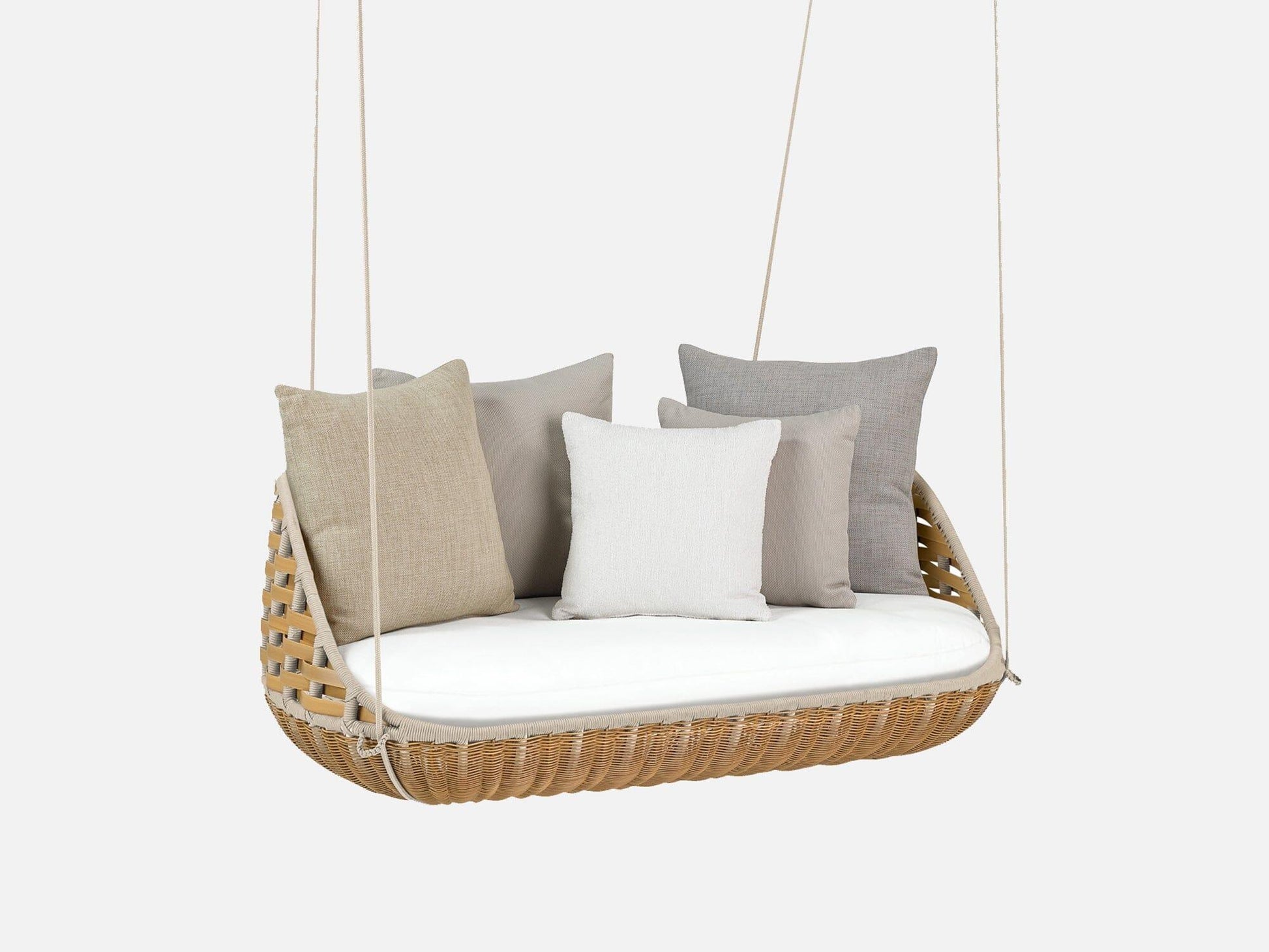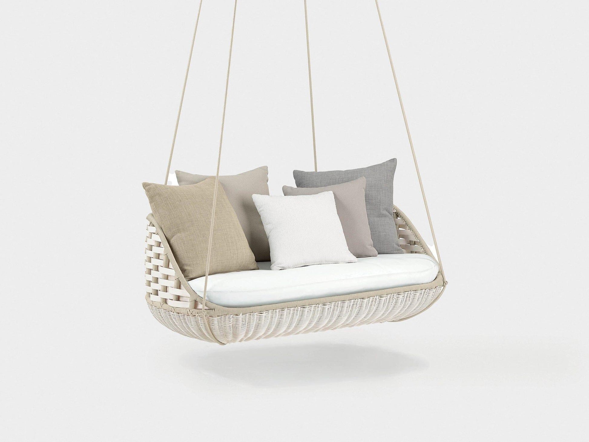 Ces canapés et fauteuils sont des exemples parfaits de design d'extérieur, disponibles en versions suspendues et sur pied. Ce canapé à bascule deux places est conçu pour deux personnes et offre un espace généreux. Même une personne seule peut y étendre confortablement ses jambes pour se détendre. Son dossier enveloppant assure un confort optimal et un maintien parfait.