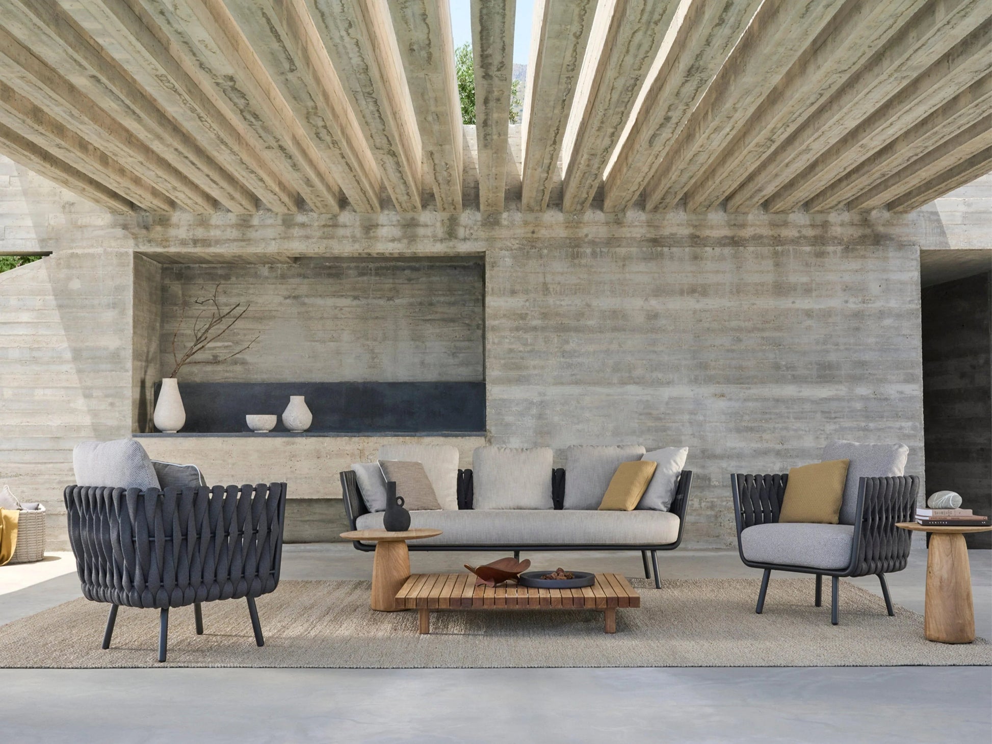 Le matériau utilisé pour le tressage est véritablement novateur : une mousse de polyuréthane est enveloppée d’une gaine sans couture en textilene tricoté et polyoléfine, ce qui la rend résistante aux intempéries tout en lui conférant une douceur surprenante au toucher. Cette collection est aussi confortable qu’elle en a l’air, et ses couleurs douces soulignent l’élégance de ce luxueux canapé d’extérieur.