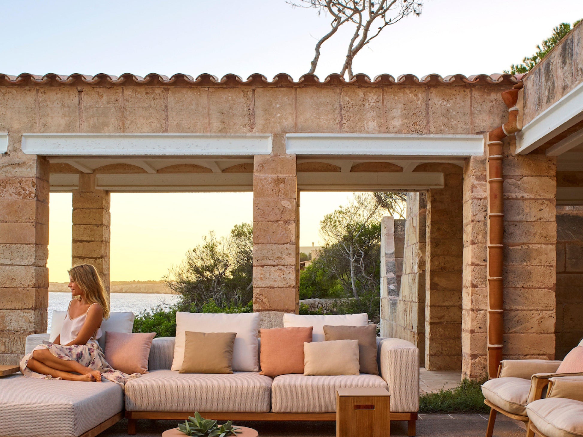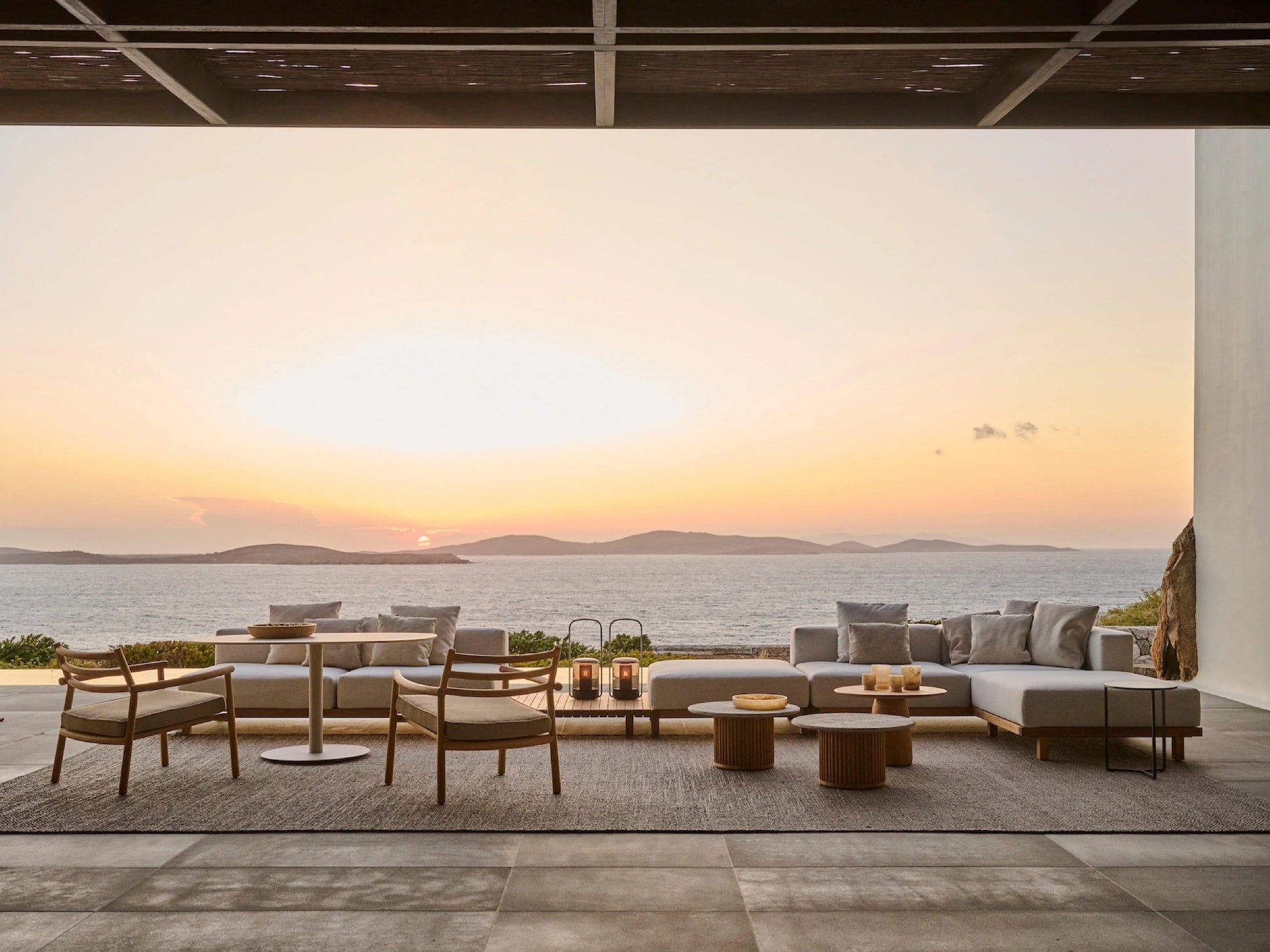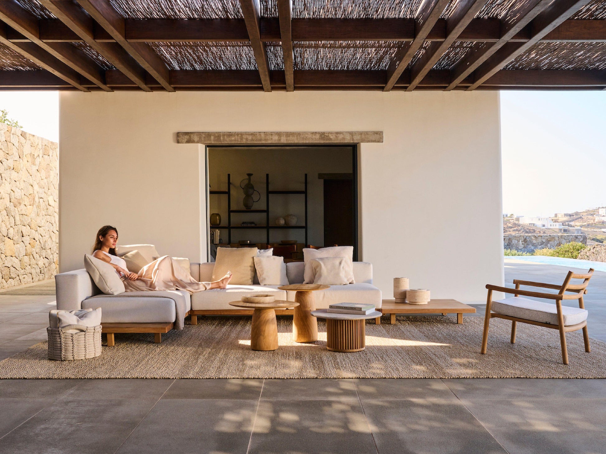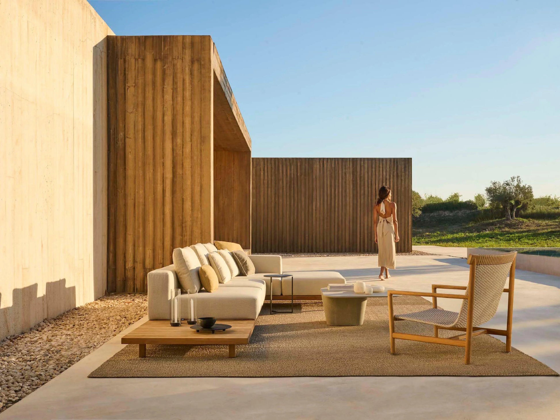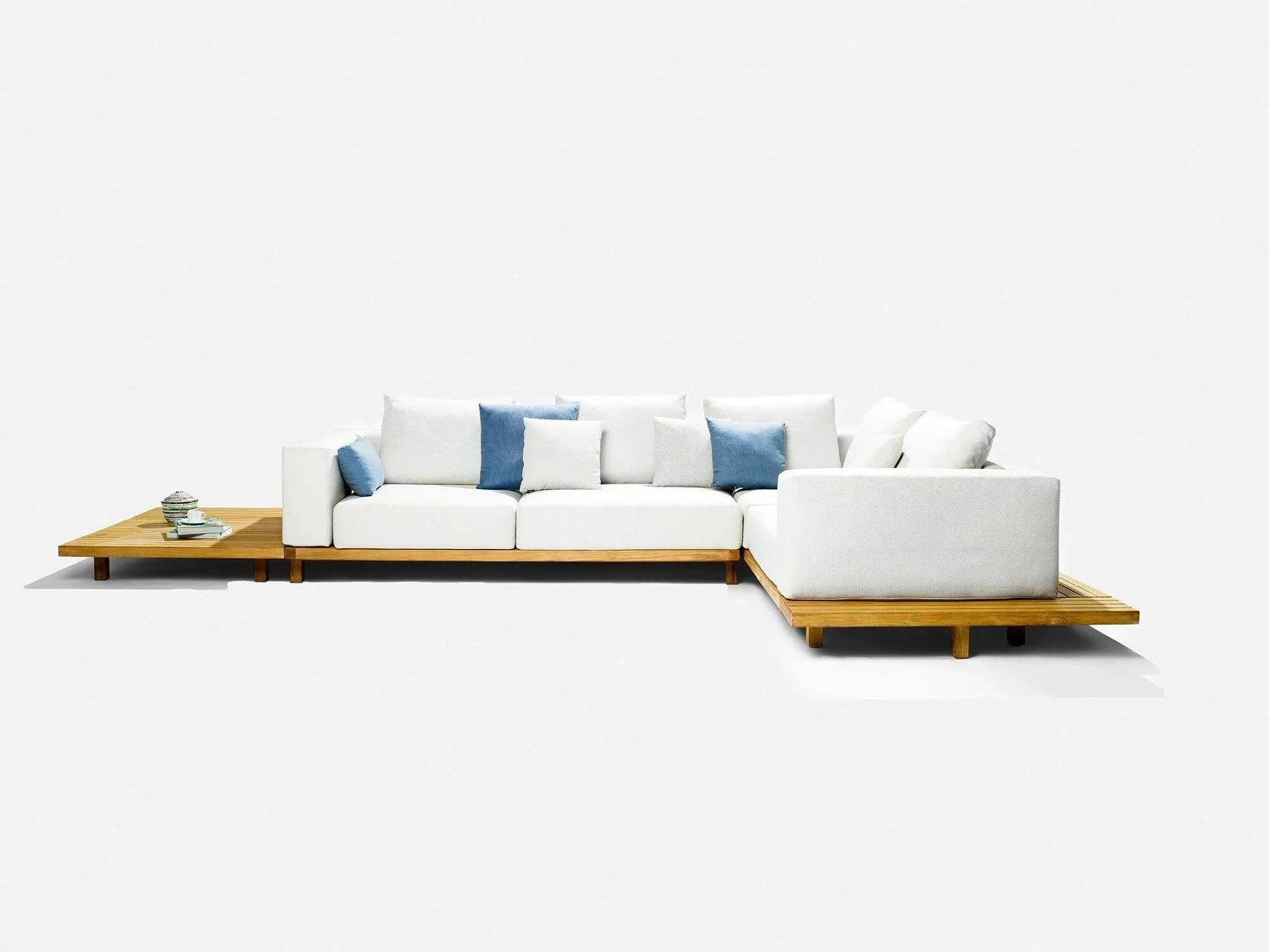 Sérénité et intemporalité, le canapé d'extérieur Vis-A-Vis se compose d'une fine plateforme en teck supportant de luxueux coussins résistants à l'eau, sans dossier ni accoudoirs apparents. Les coussins sont soutenus par des supports en acier inoxydable, ce qui confère au canapé une esthétique irréprochable sous tous les angles. Cette collection modulaire offre une infinité de compositions pour s'adapter à votre espace et créer un effet sur mesure.
