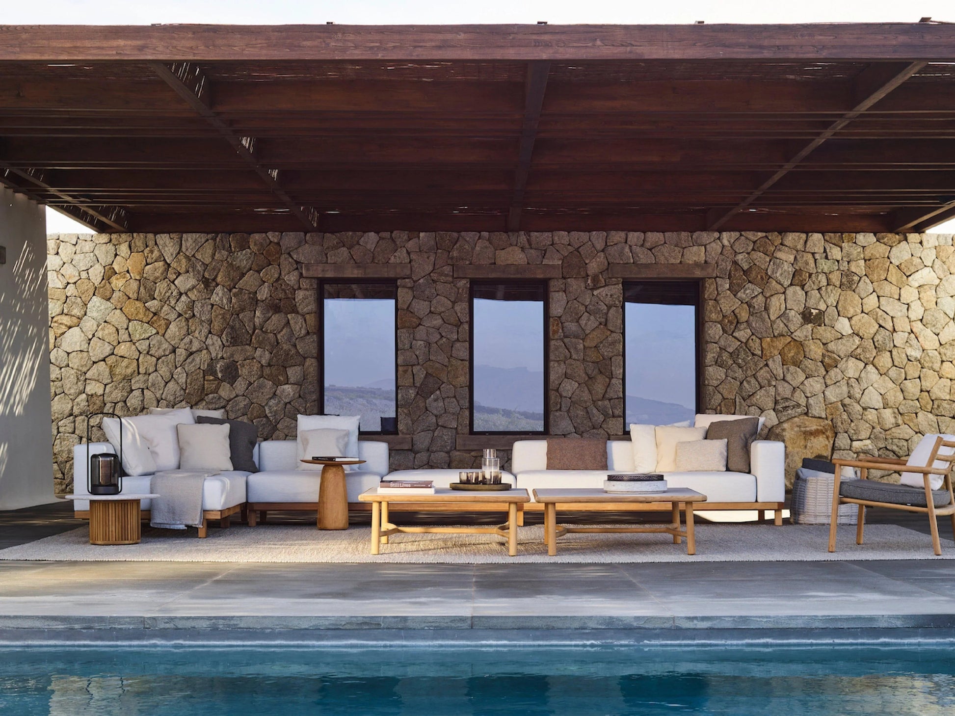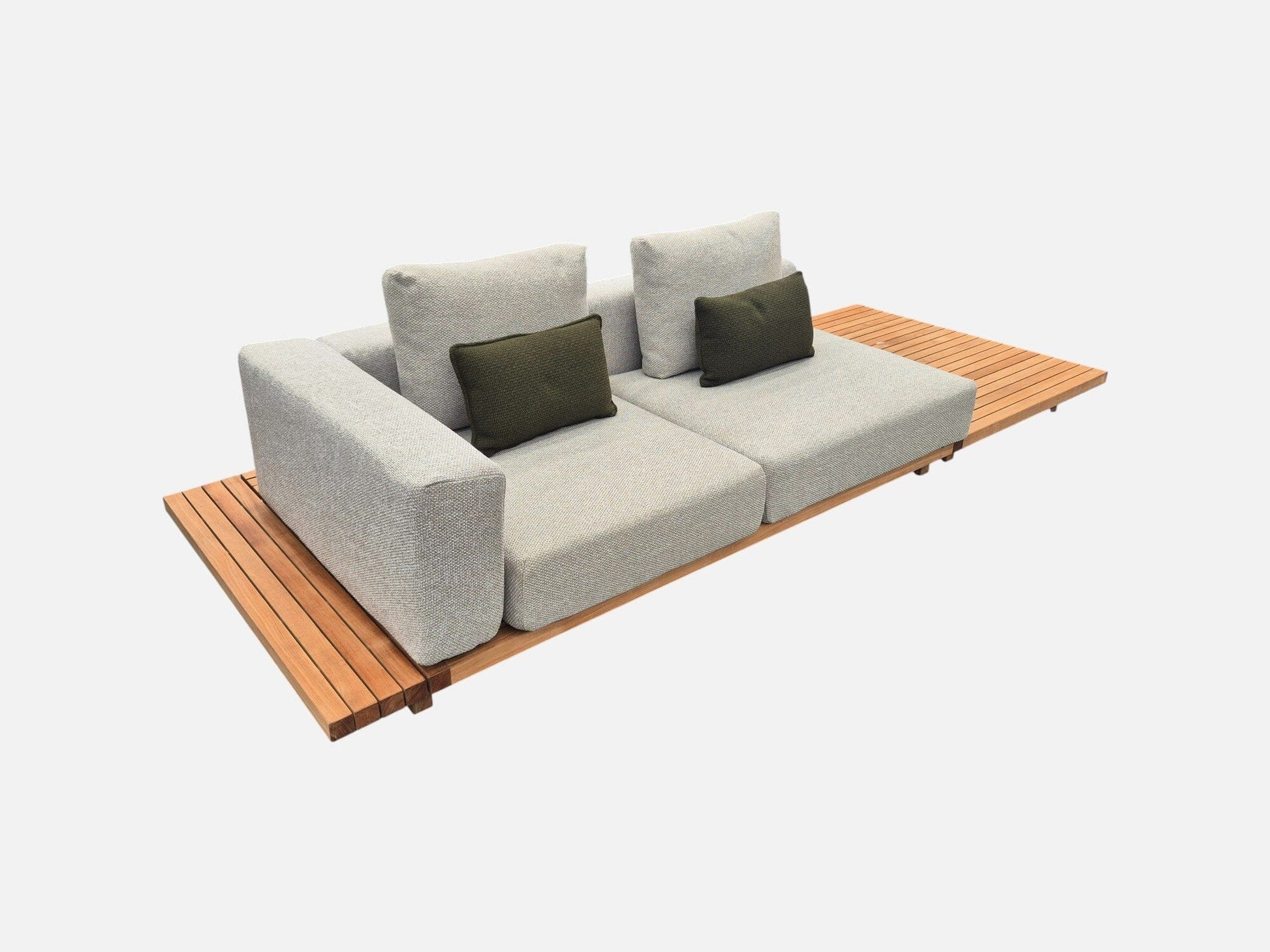 Sérénité et intemporalité, ce canapé d'extérieur se compose d'une fine plateforme en teck supportant de luxueux coussins résistants à l'eau, sans dossier ni accoudoirs apparents. Les coussins sont soutenus par des supports en acier inoxydable, ce qui confère au canapé une esthétique impeccable sous tous les angles. Cette collection est un système modulaire permettant une infinité de compositions pour s'adapter à votre espace et créer un effet sur mesure.